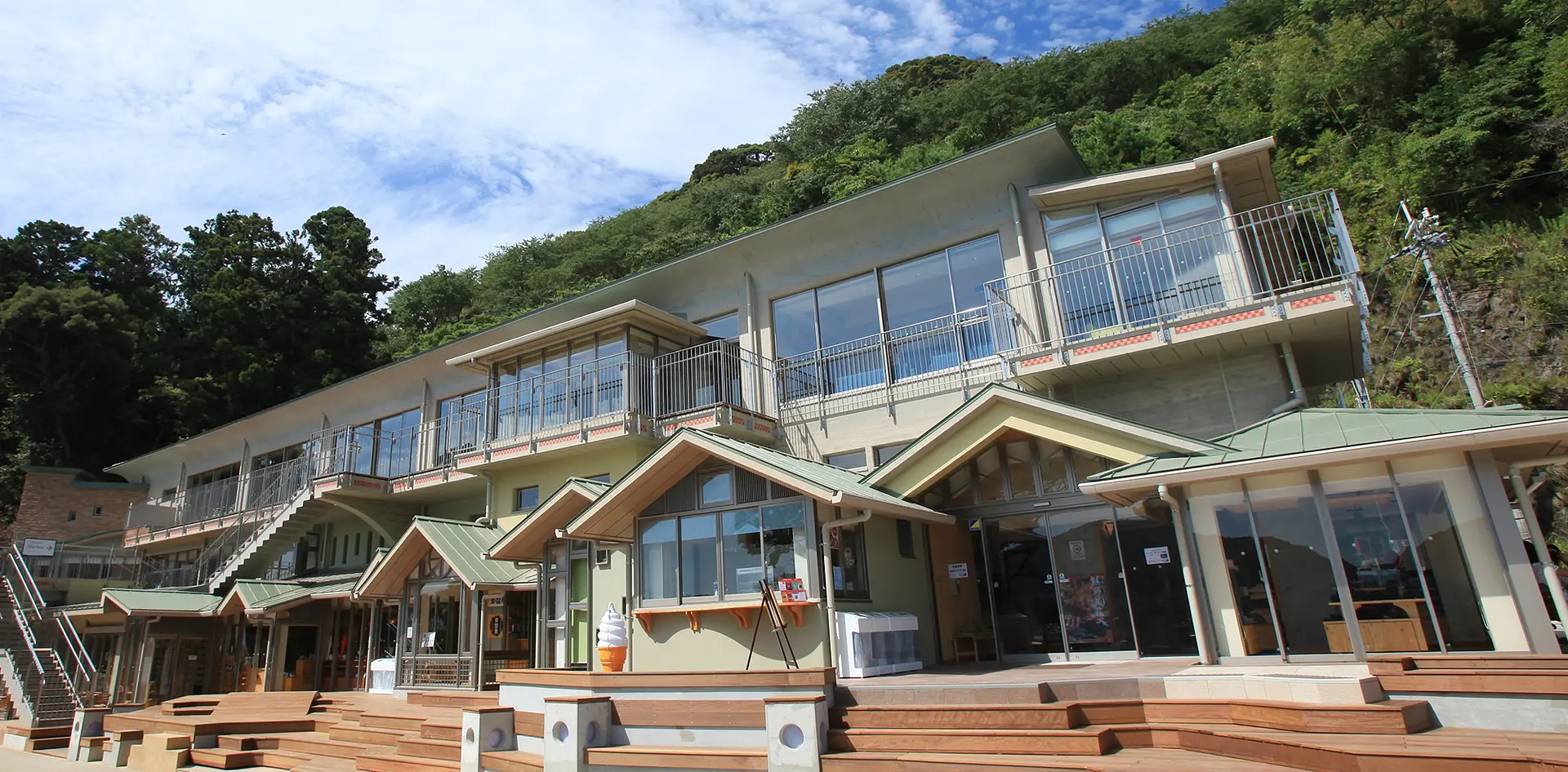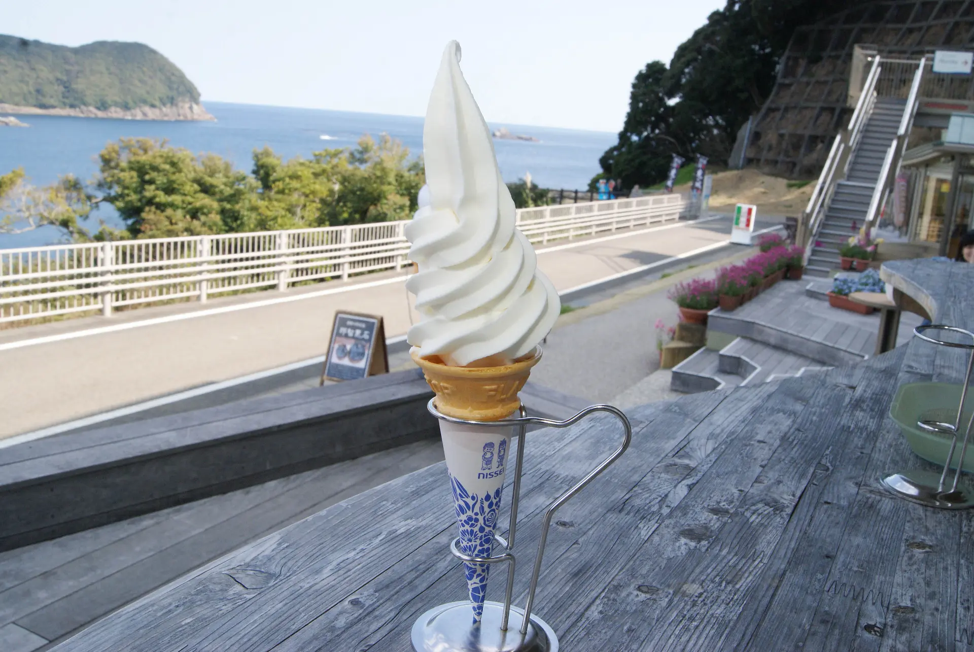 海を見ながらリラックスしたひとときを過ごせるカフェでは、熊野で発見された柑橘「新姫」を使ったソフトクリームが人気。ほどよい酸味が売りで、幅広い世代に好評!