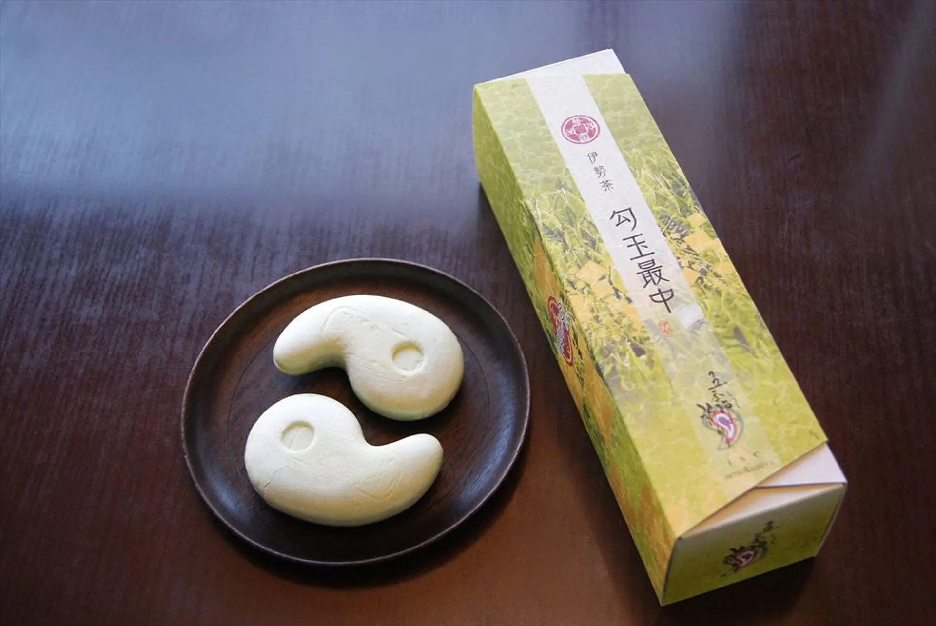 お店の新しいイチオシは、伊勢茶の餡にホワイトチョコチップが入った「勾玉最中」。ホワイトチョコを入れるというアイデアが斬新!