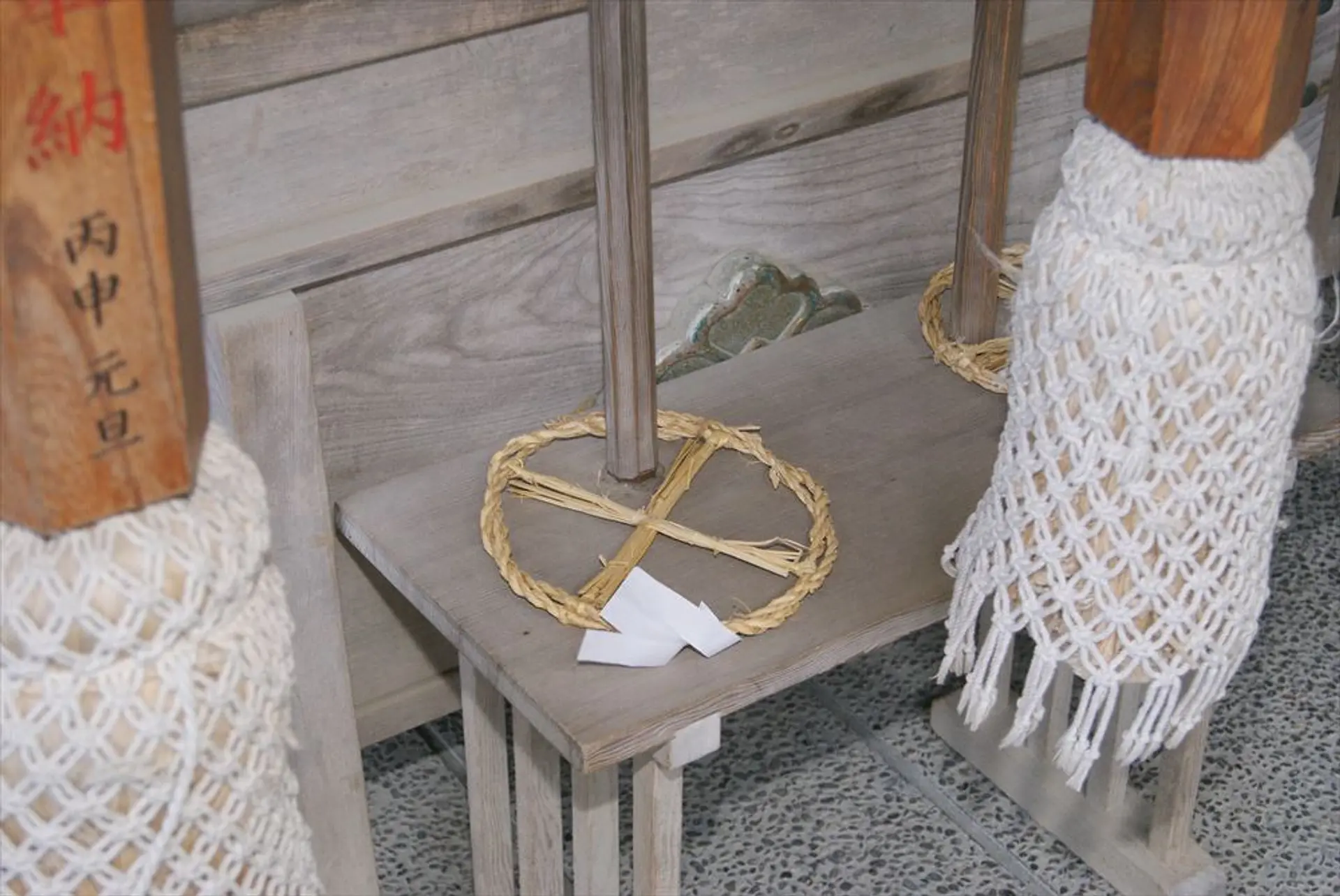 本殿前に置かれている「輪注連縄」。身体をさすり、身のけがれや身体の悪い所を輪注連縄に託し、納めるとのこと。また初めての良い経験ができました!