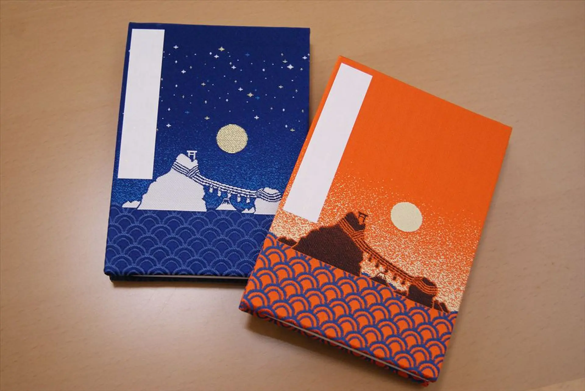 社務所で授与できる「御朱印帳」。夫婦岩がおしゃれにデザインされた表紙が人気です。青色のバージョンは、「夫婦岩の間から月が昇る様子」(10月から1月の満月の頃に見られるそう)が描かれています。