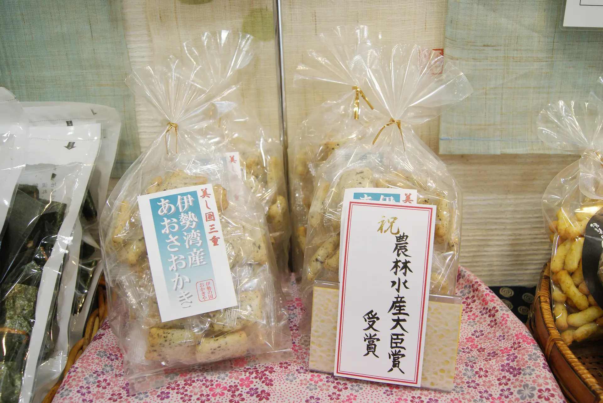 写真の「みえ川越町産 あられにしよか」マヨネーズ味は、人気NO.1商品。それぞれ厳選した海老、あおさ、ごまを贅沢に使用していて、一度食べると止まらなくなります!