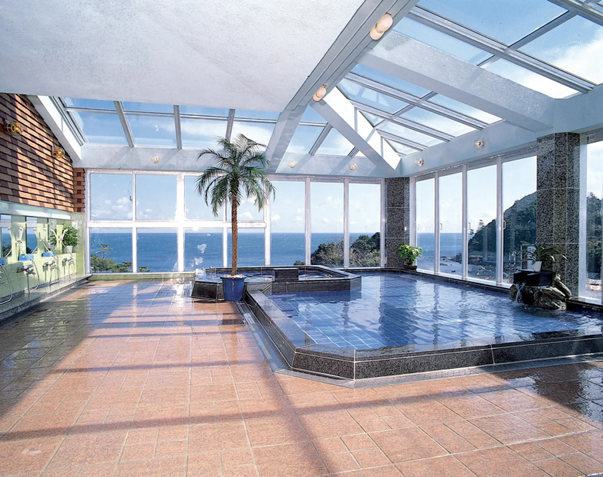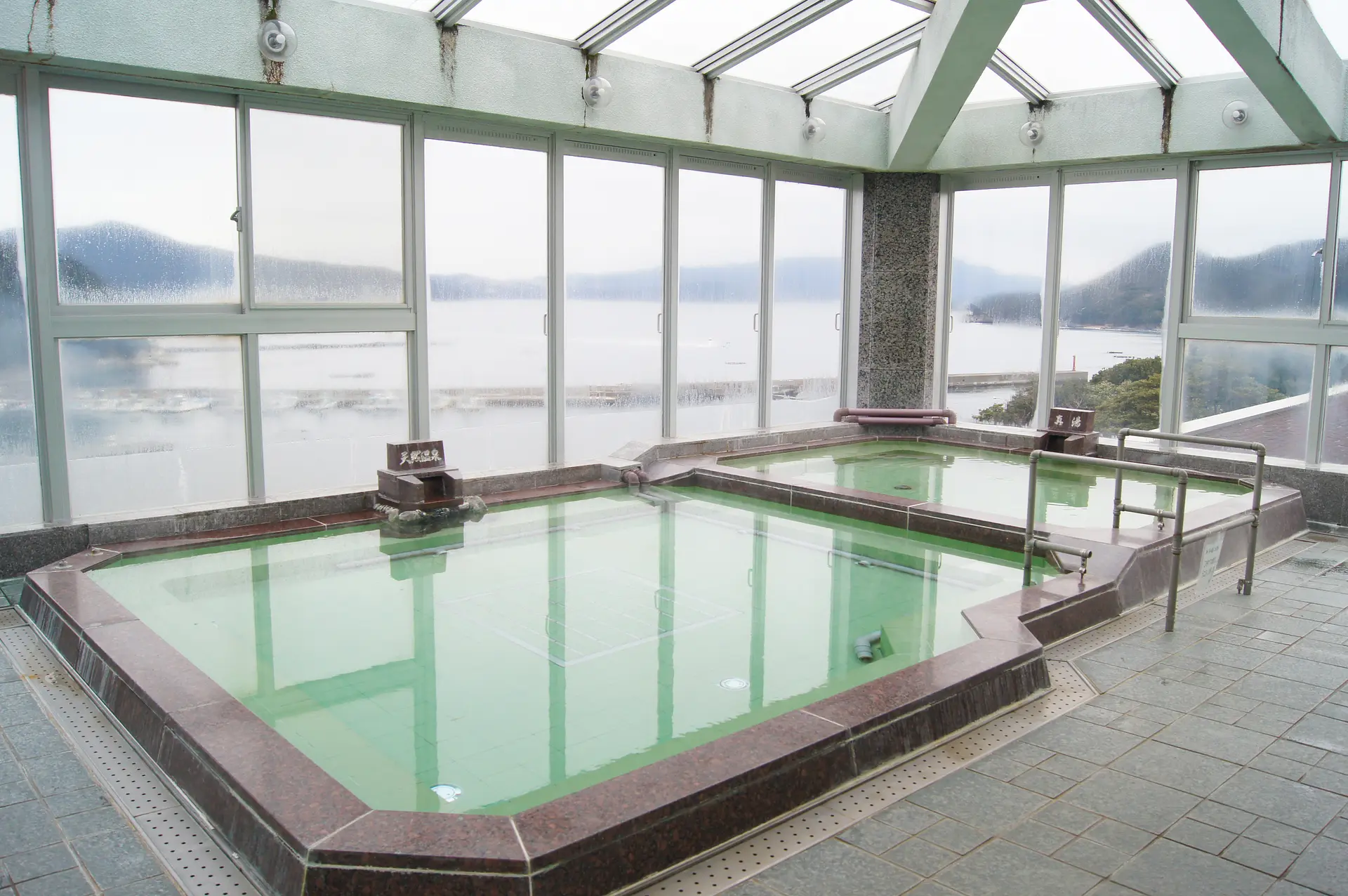 島の町並みと自然が一体化する「ここにしかない景色」を眺めながら、天然温泉のお湯でゆったり。展望大浴場は男湯(写真上)と女湯(写真下)の2種類。日々の忙しさを忘れられる気持ち良さをつくり出してくれる空間です。