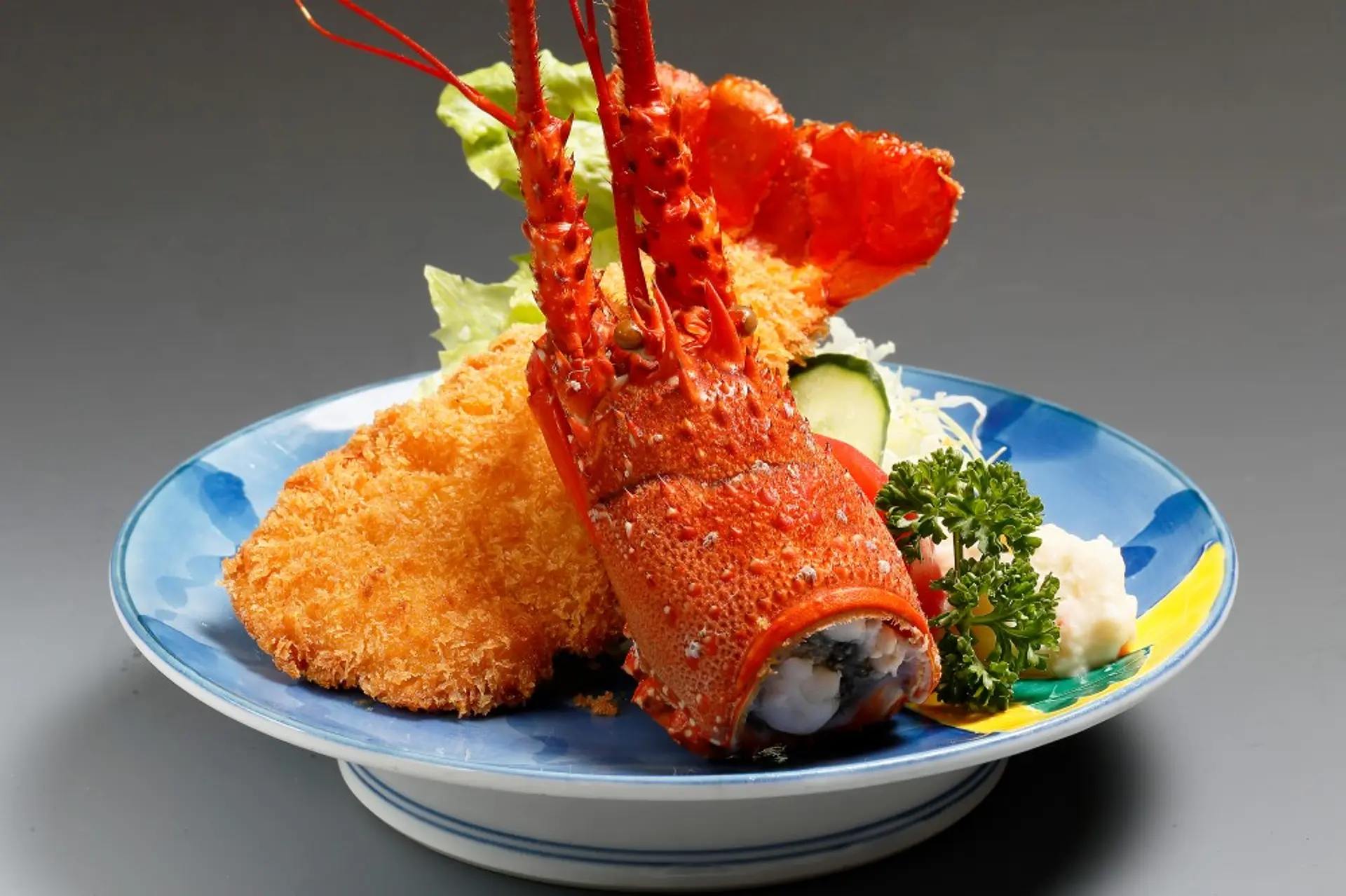 別注料理の「伊勢エビフライ」は、その豪快な調理方法と見た目のかわいらしさに惹かれます。カリッとした衣の中には、プリプリとした食感の海老の旨みがギュッと詰まっています。