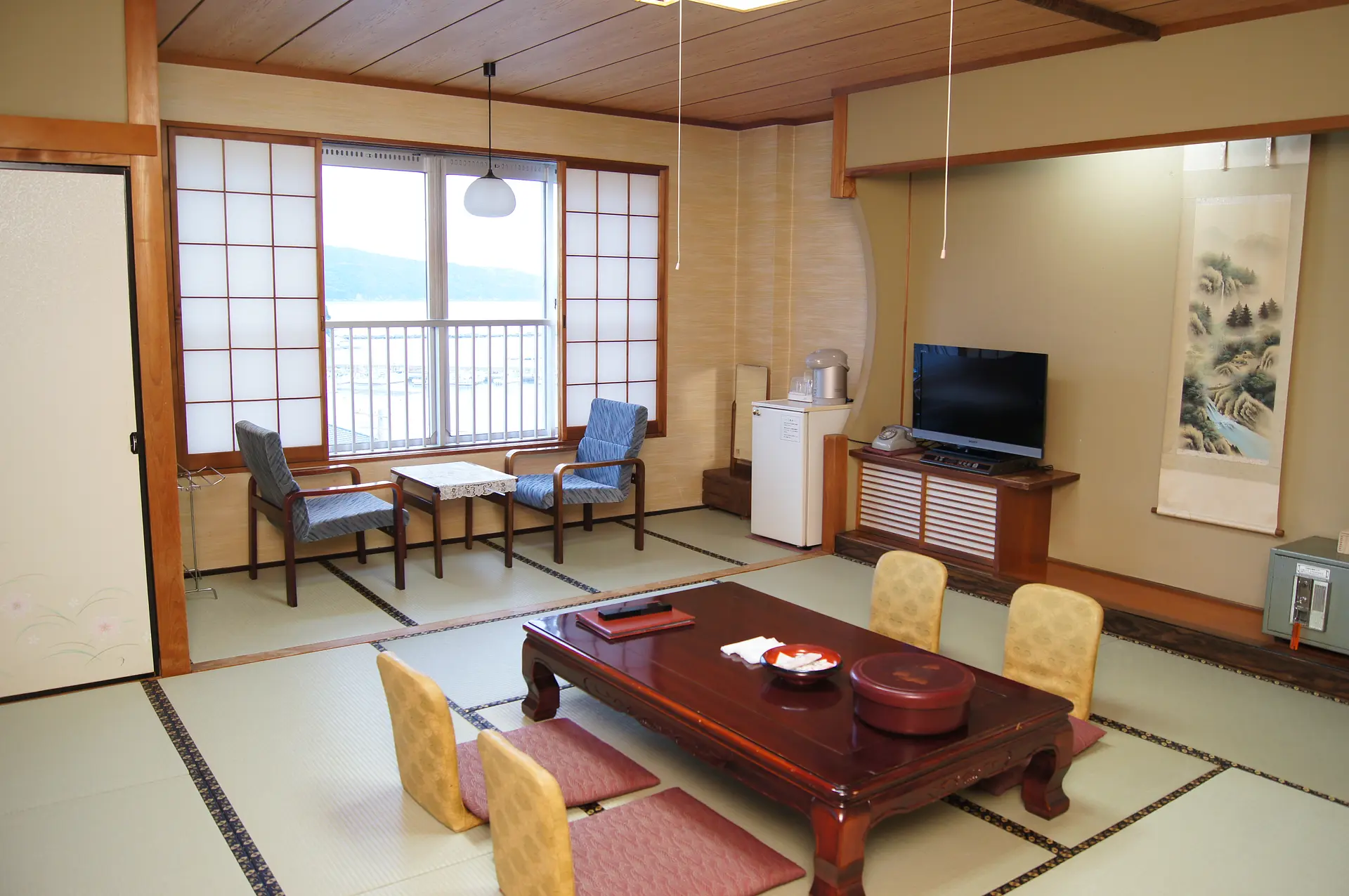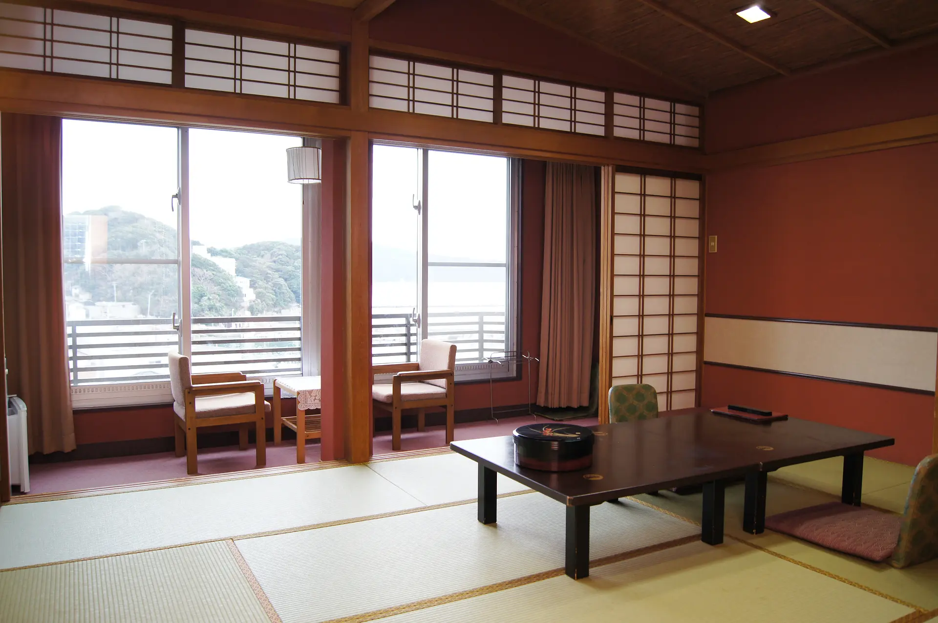 「景色をゆっくり楽しんでもらいたい」と客室の窓が大きいのも、この宿のこだわり。写真は、通常タイプの客室。答志島には、釣りを目当てに訪れるお客さんも多く、春にはメバル、夏にはキスなどが釣れるとのこと。釣りを楽しんだあとも、この部屋なら、ゆっくり休めそう。