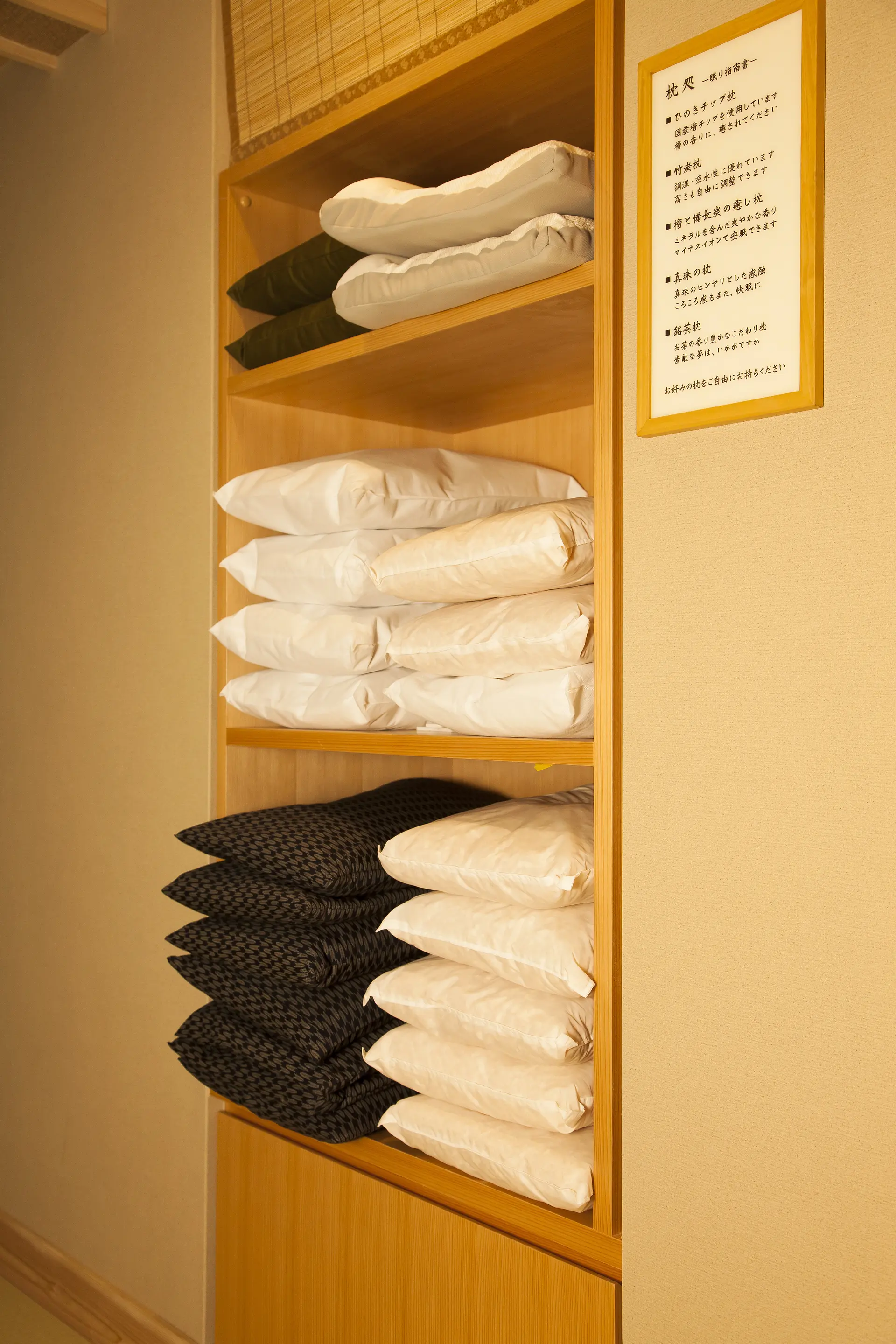 なんと、素材や形状など、多種多様な枕から自分の好みを選ぶことができるんです!旅先で枕が合わないのはちょっと辛いですよね・・。
