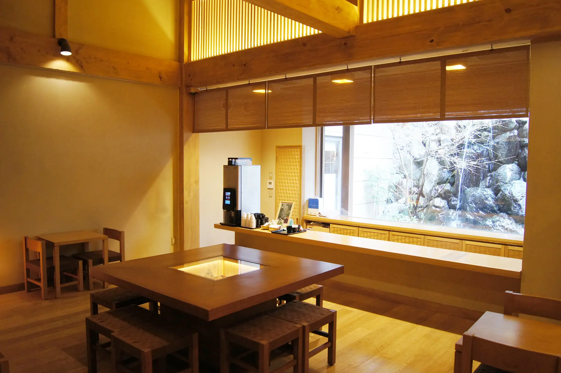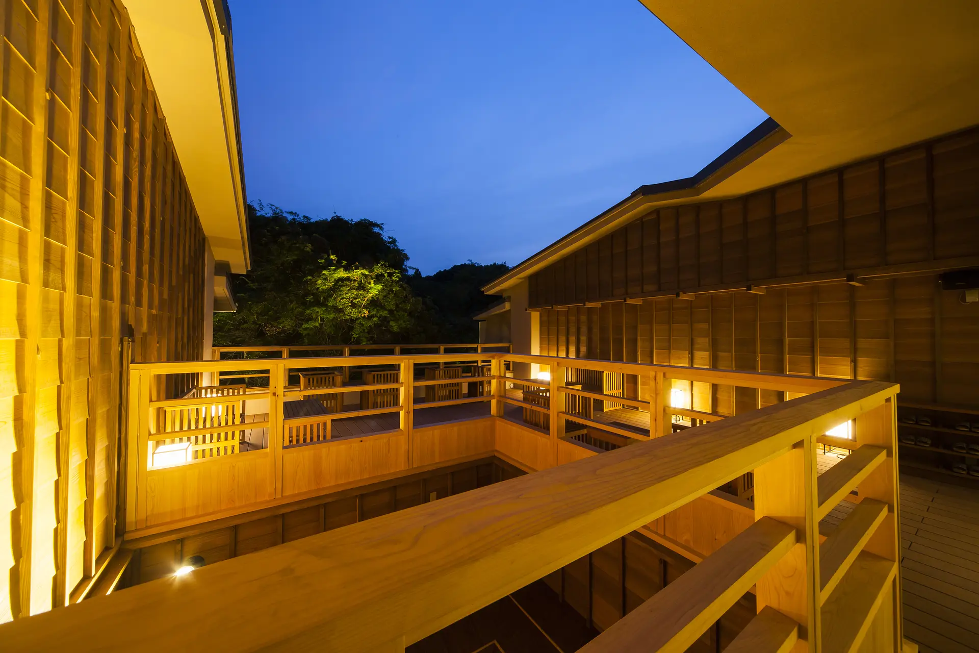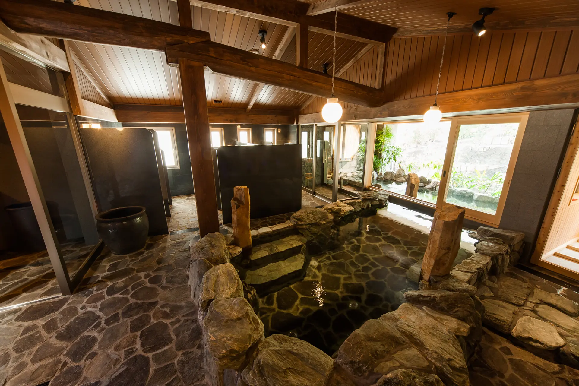 大浴場の一つは、檜風呂の「社(やしろ)の湯」。周辺の自然とのコントラストを表現するために、温かみのある造りになっています。檜のさわやかな香りがお風呂いっぱいに広がり、心からリラックスできる空間に。
