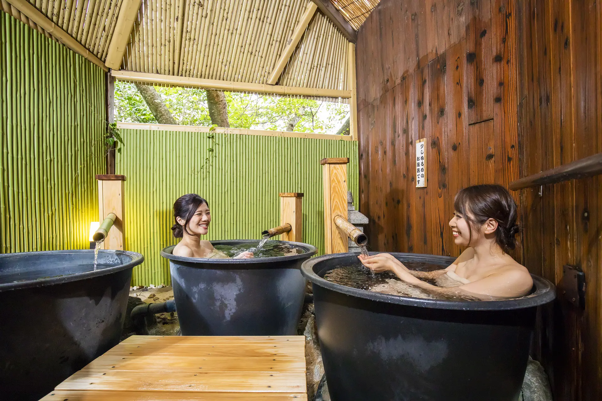 女湯の「花の賀」は、樽・瓶・岩風呂があり、楽しみながら癒しタイムを過ごすことができますよ。