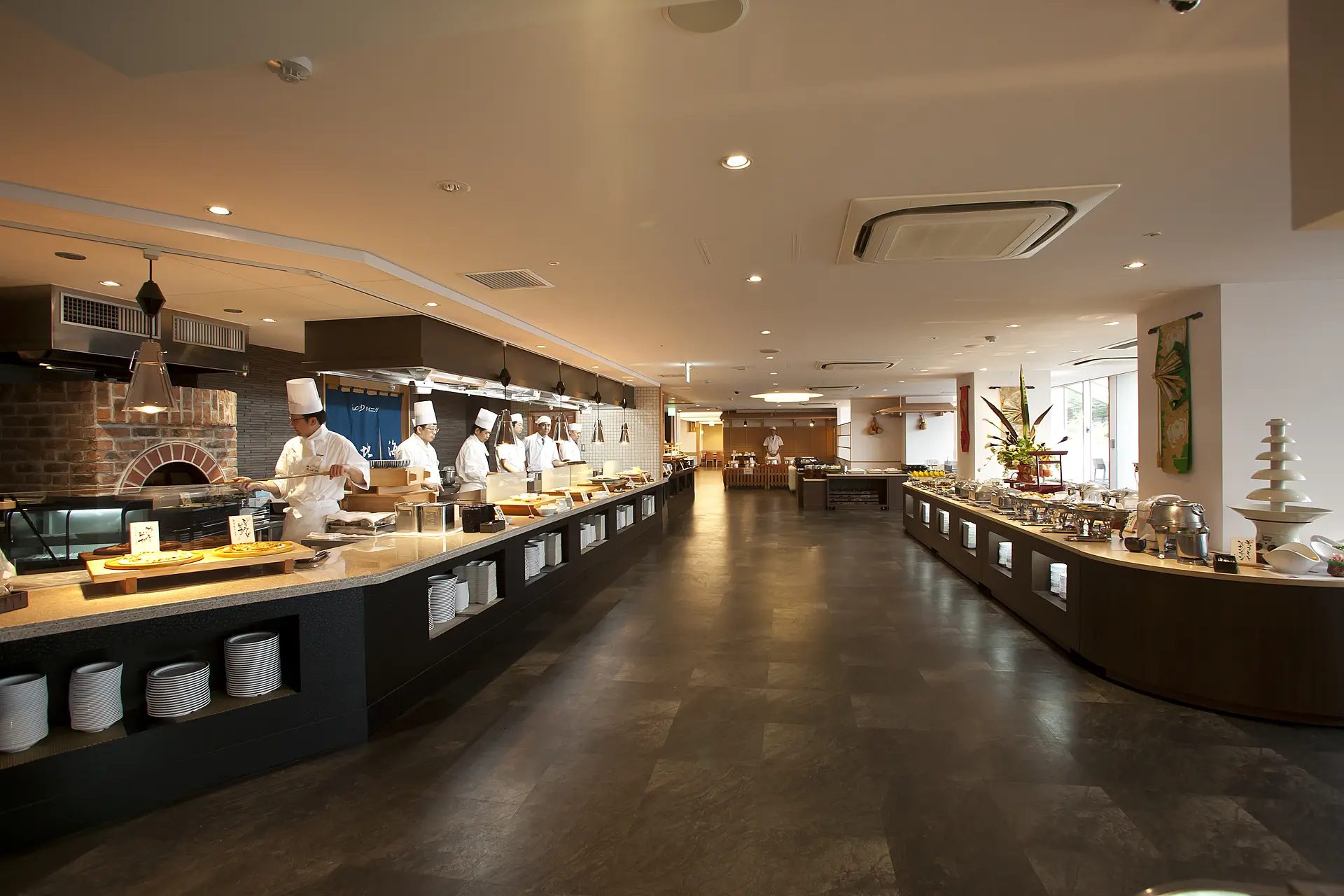 和洋さまざまなメニューが並び、料理人が豪快かつ繊細に調理する「ライブキッチン」や、炊きたてご飯を味わえる「土かまど」スペースなど、店内では目移り必至!