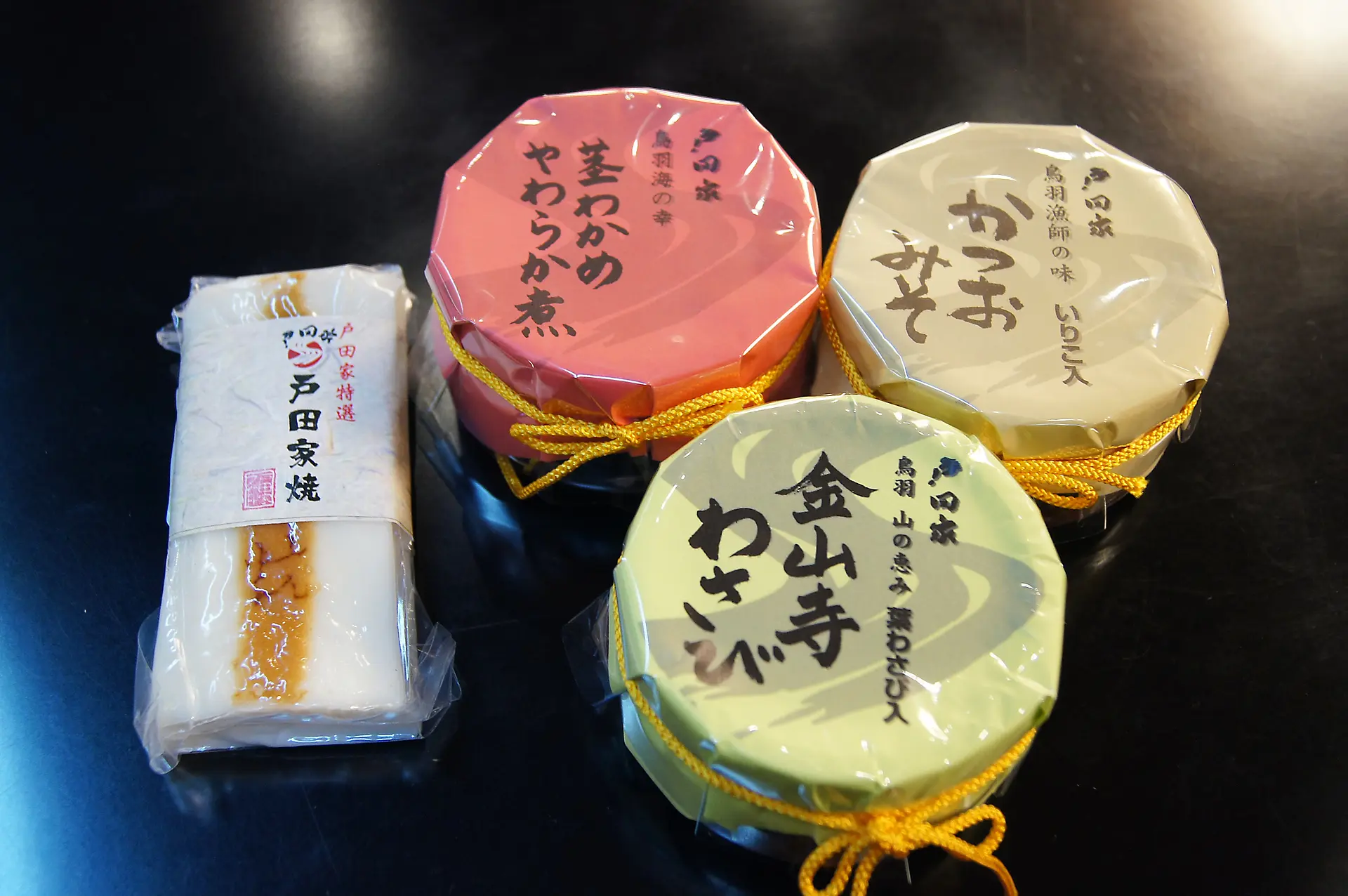 「金山寺わさび」「茎わかめ やわらか煮」「かつおみそ」(各種760円/税込)は、どれもご飯のお供に最適。「戸田家」の焼き印が入ったかまぼこ「戸田家焼」(1個380円/税込)も旅の記念になりそうです。
