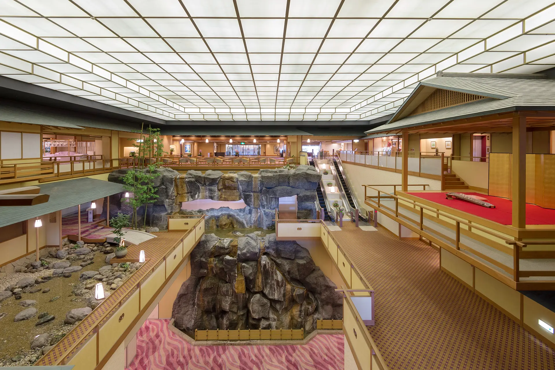 滝が流れる三層吹き抜けの「アトリウム和風庭園」は、この旅館のシンボルの一つで、日本人の心「わび・さび」の奥深さを感じさせてくれます。