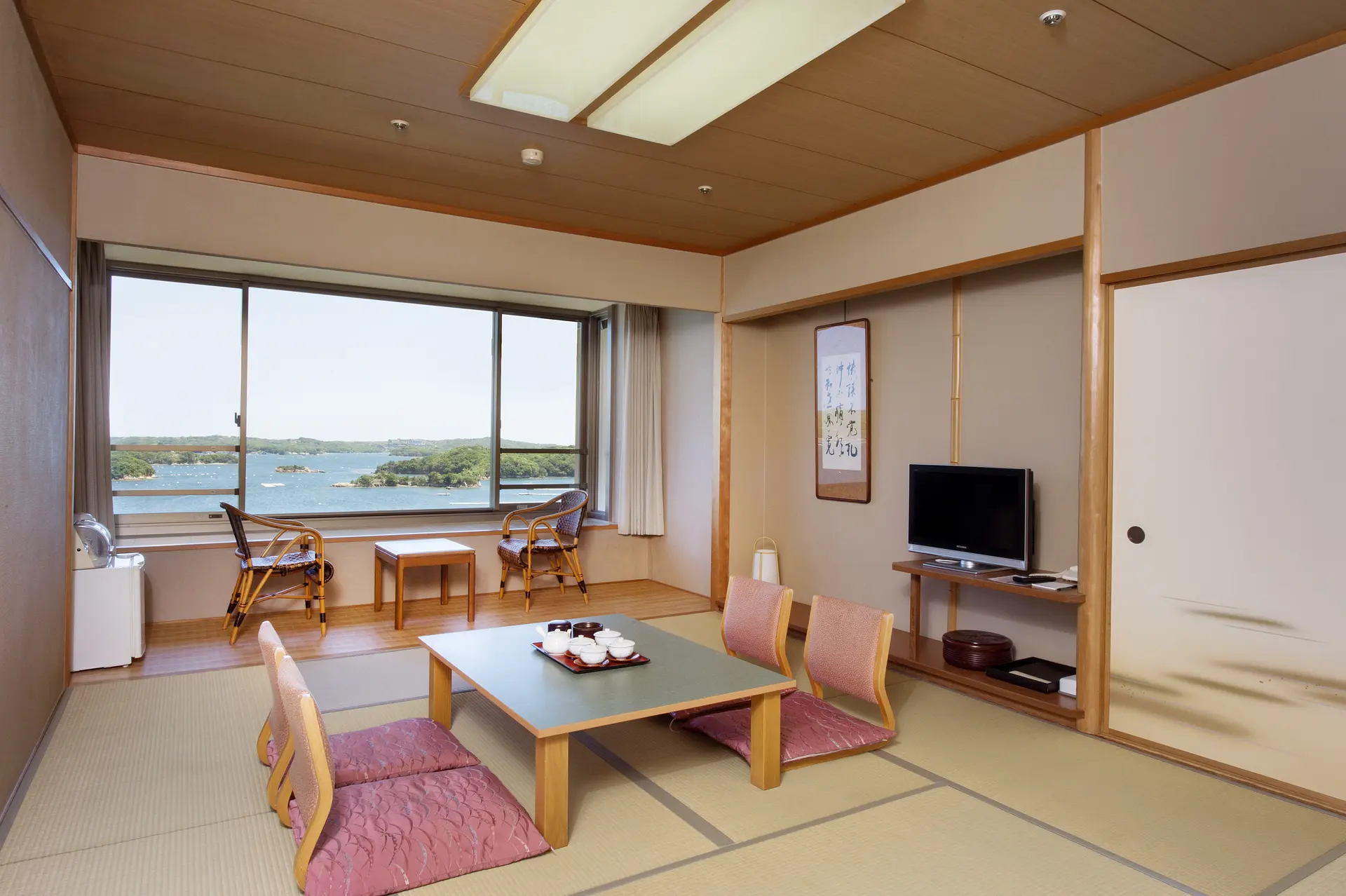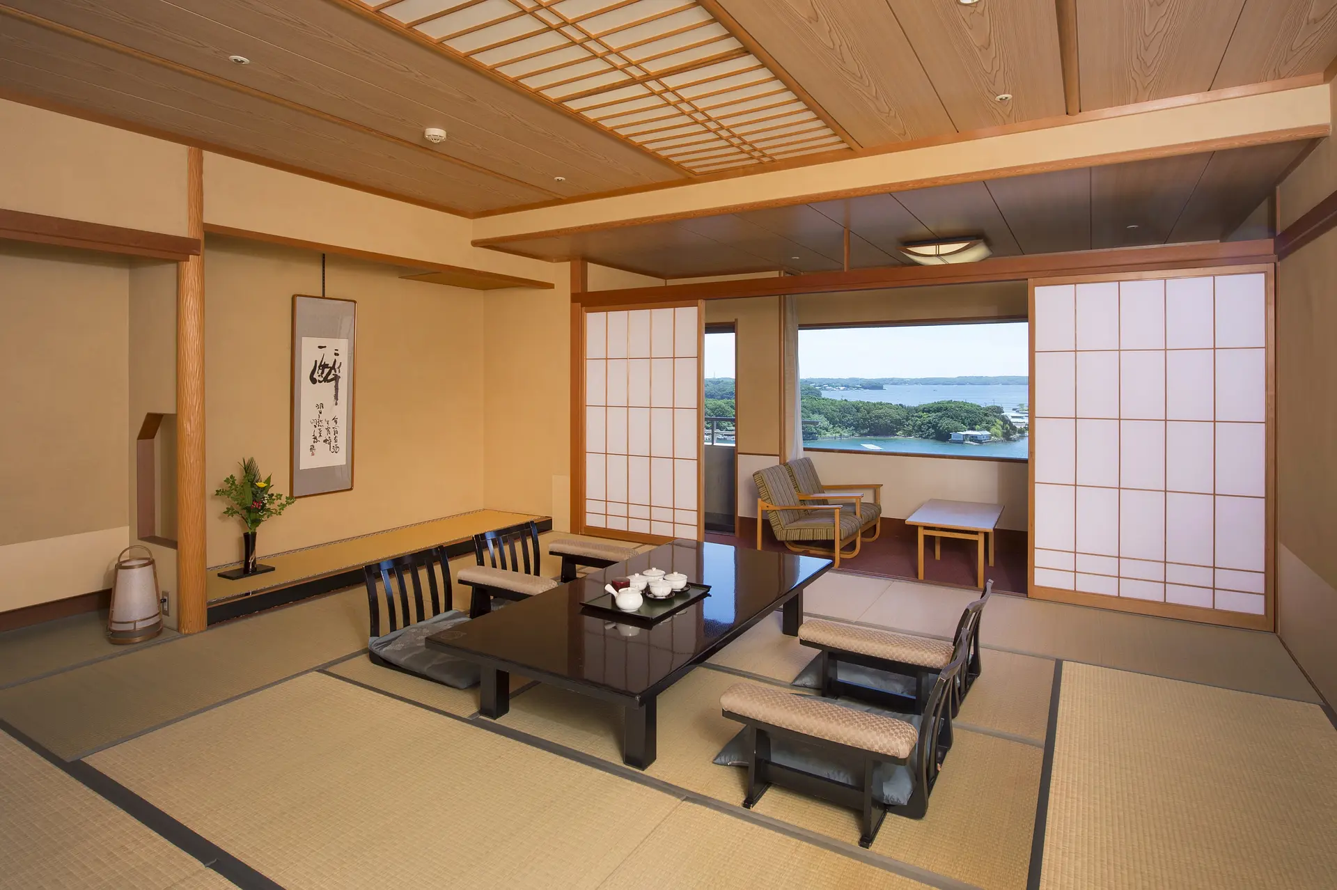 「賢島宝生苑」は、「燦陽(さんよう)棟」と、「華陽(かよう)棟」の2棟からなり、全室オーシャンビュー!写真は、「燦陽棟」の基準客室。
