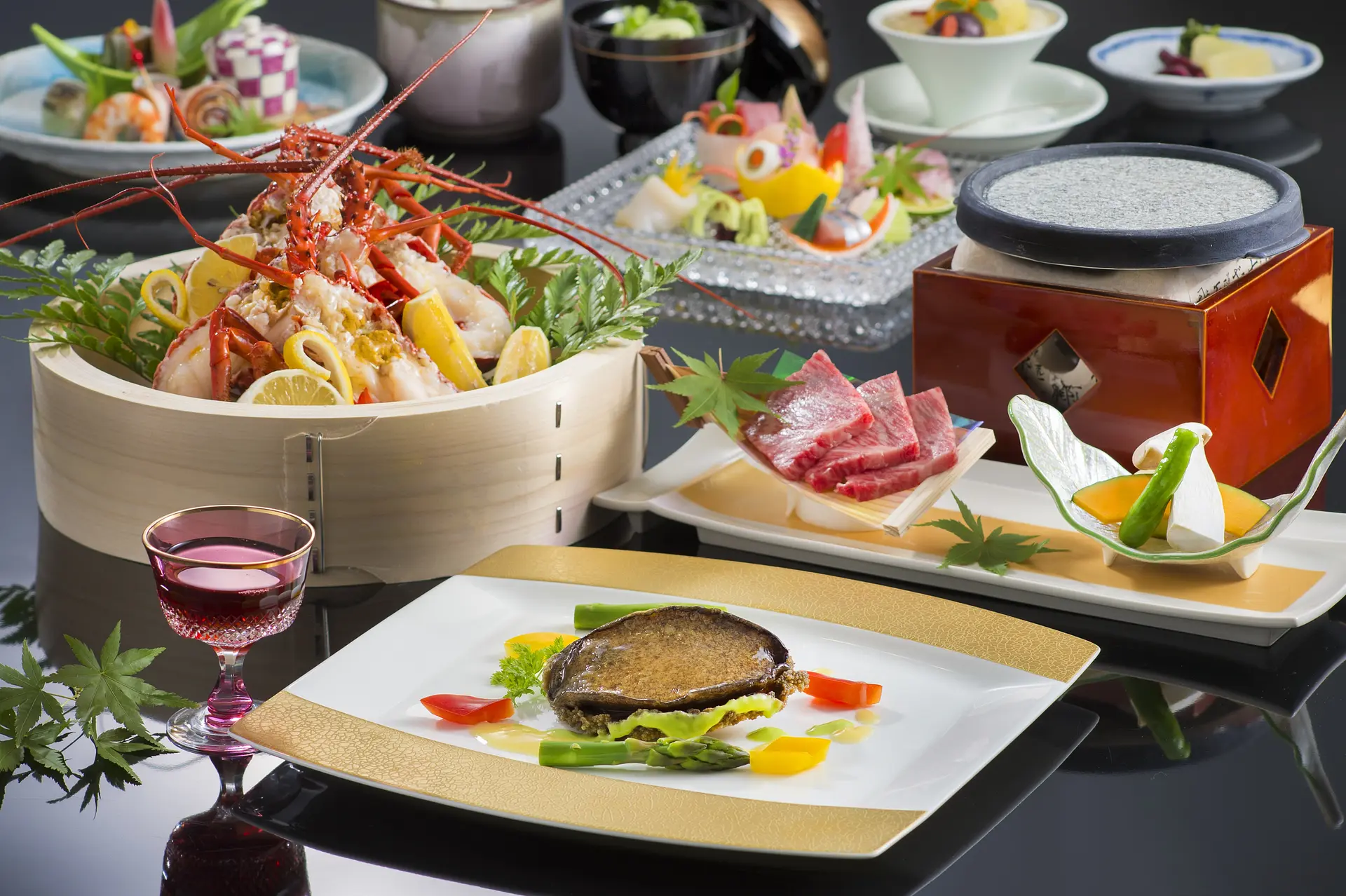 「味重めぐり会席」は、伊勢海老・鮑・松阪牛の「三大味覚」を楽しめるコース。選び抜かれたブランド食材の料理は、逸品ぞろい!