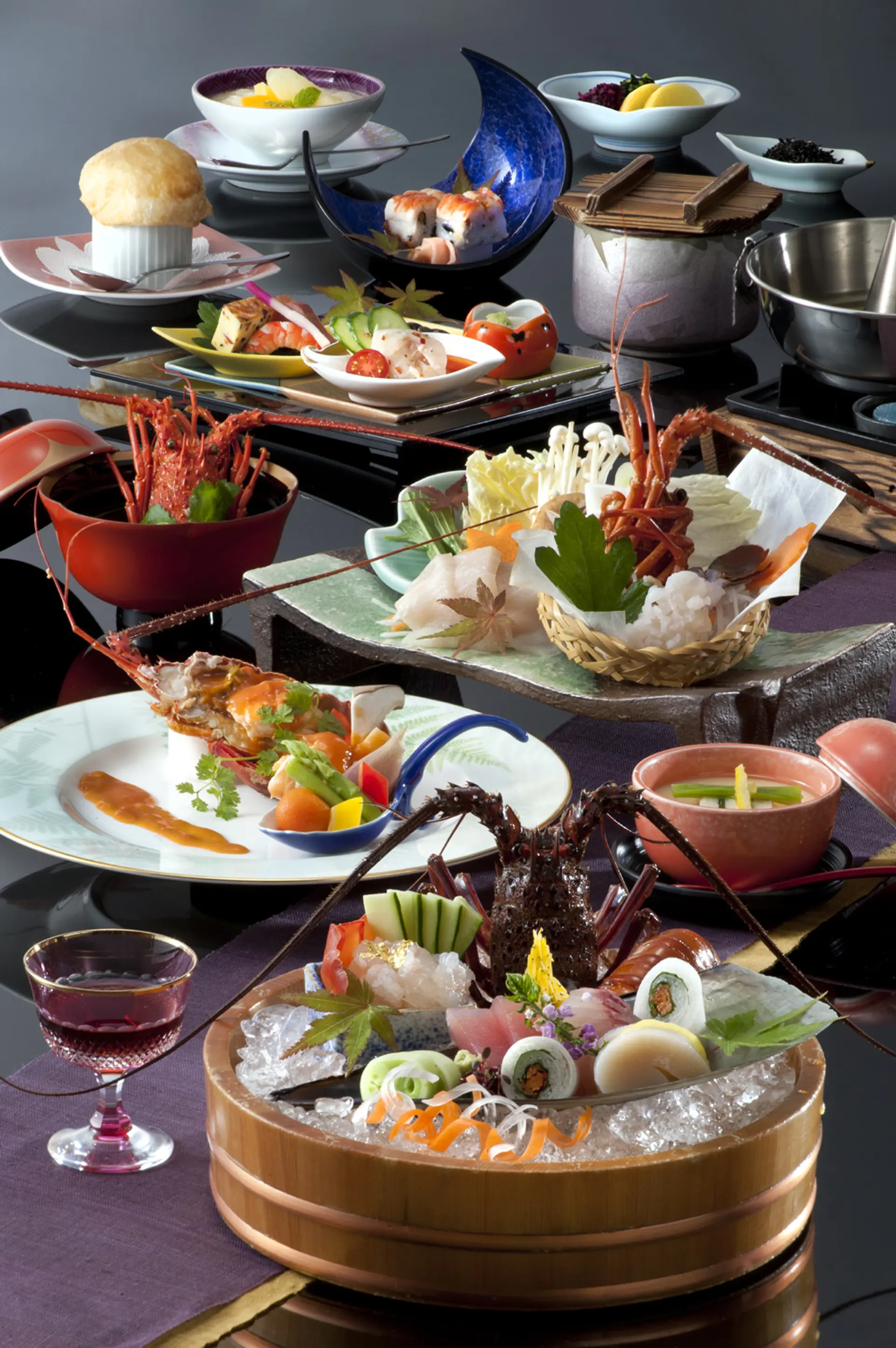 「姿造り」をはじめ、「しゃぶしゃぶ」や「香り焼き」など、三重県産伊勢海老(約2.5尾)をさまざまな調理法で存分に味わえる「伊勢海老づくし会席」(秋冬限定のコース)。