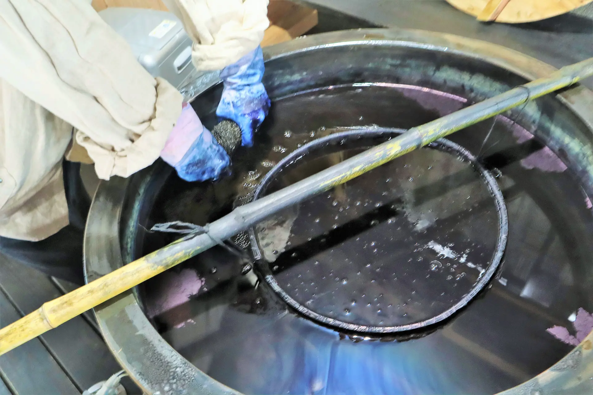 手を放さないように持ち手を変えながら、酸素を藍液に入れないように静かに漬け込むのがポイント。