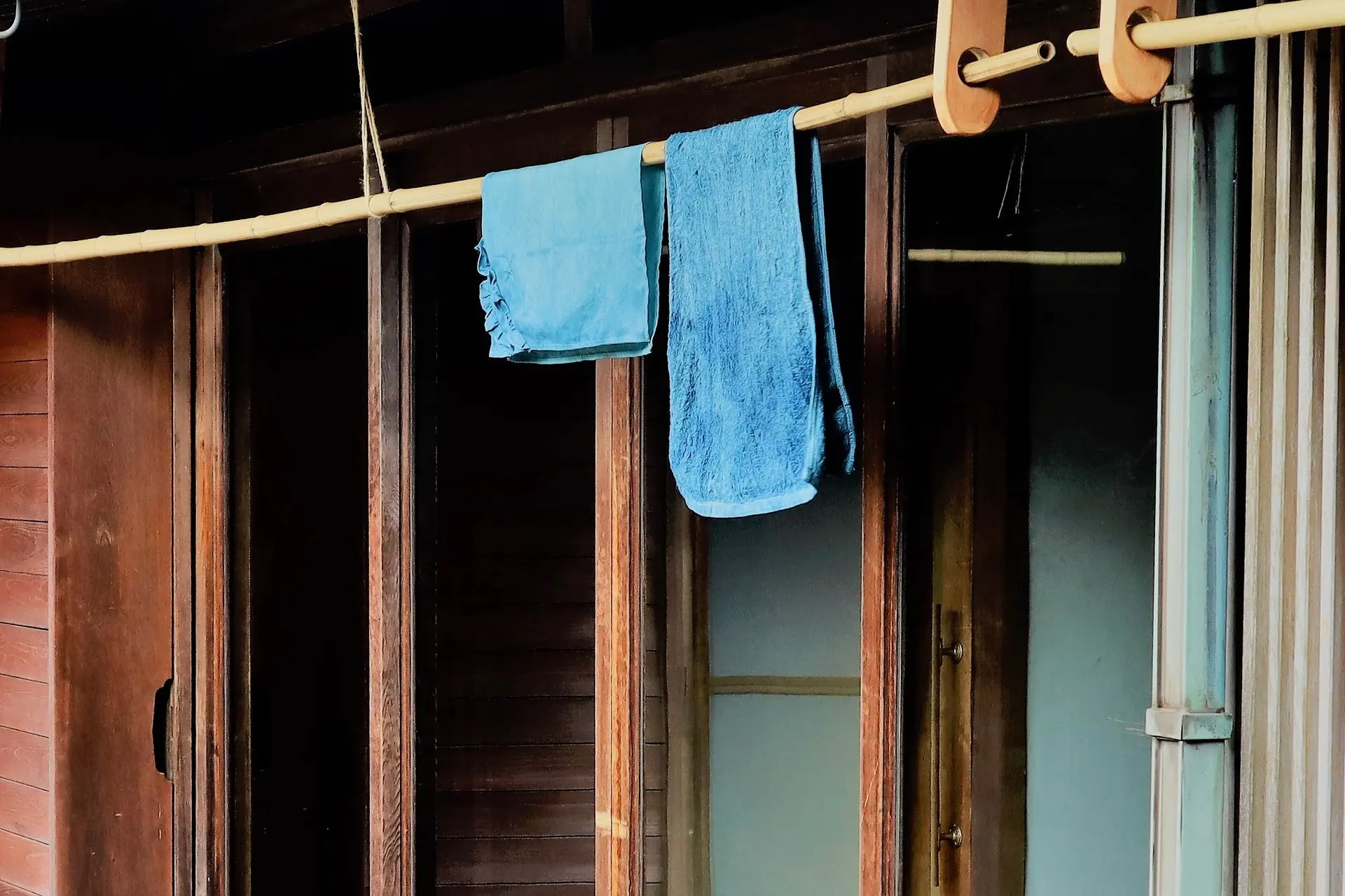 干している時間はおよそ30分、紫外線に当てて藍の色を布に定着させていきます。