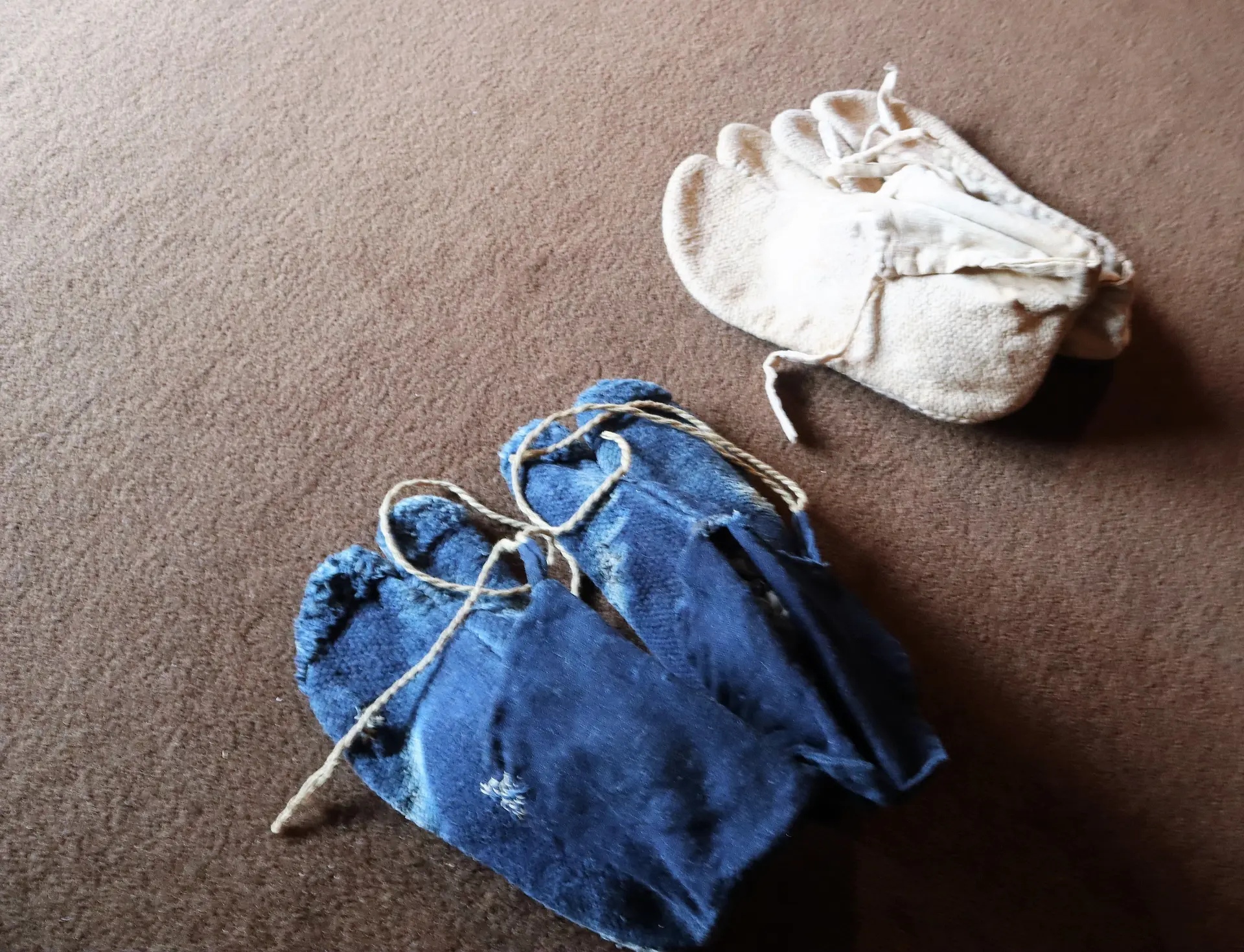 写真は、江戸時代、実際に使用されていた足袋。下の足袋は藍染めが施されていて、今も変わらぬ藍の鮮やかさにビックリ。