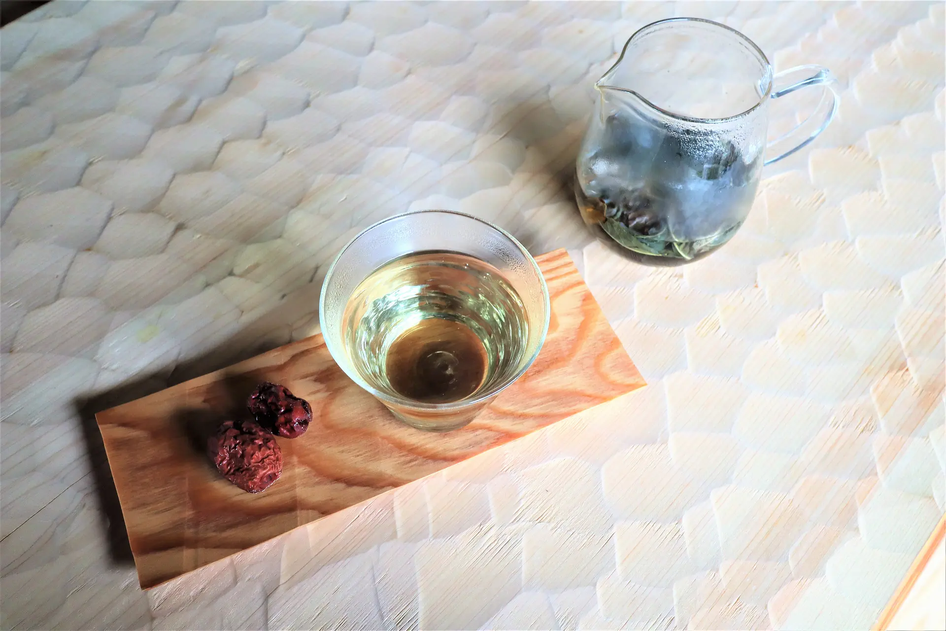 藍染め体験後にいただいたのが「藍の葉茶」とドライフルーツ(なつめ)。お茶うけはその時々で、木の実やドライフルーツの種類が変わるとのこと。