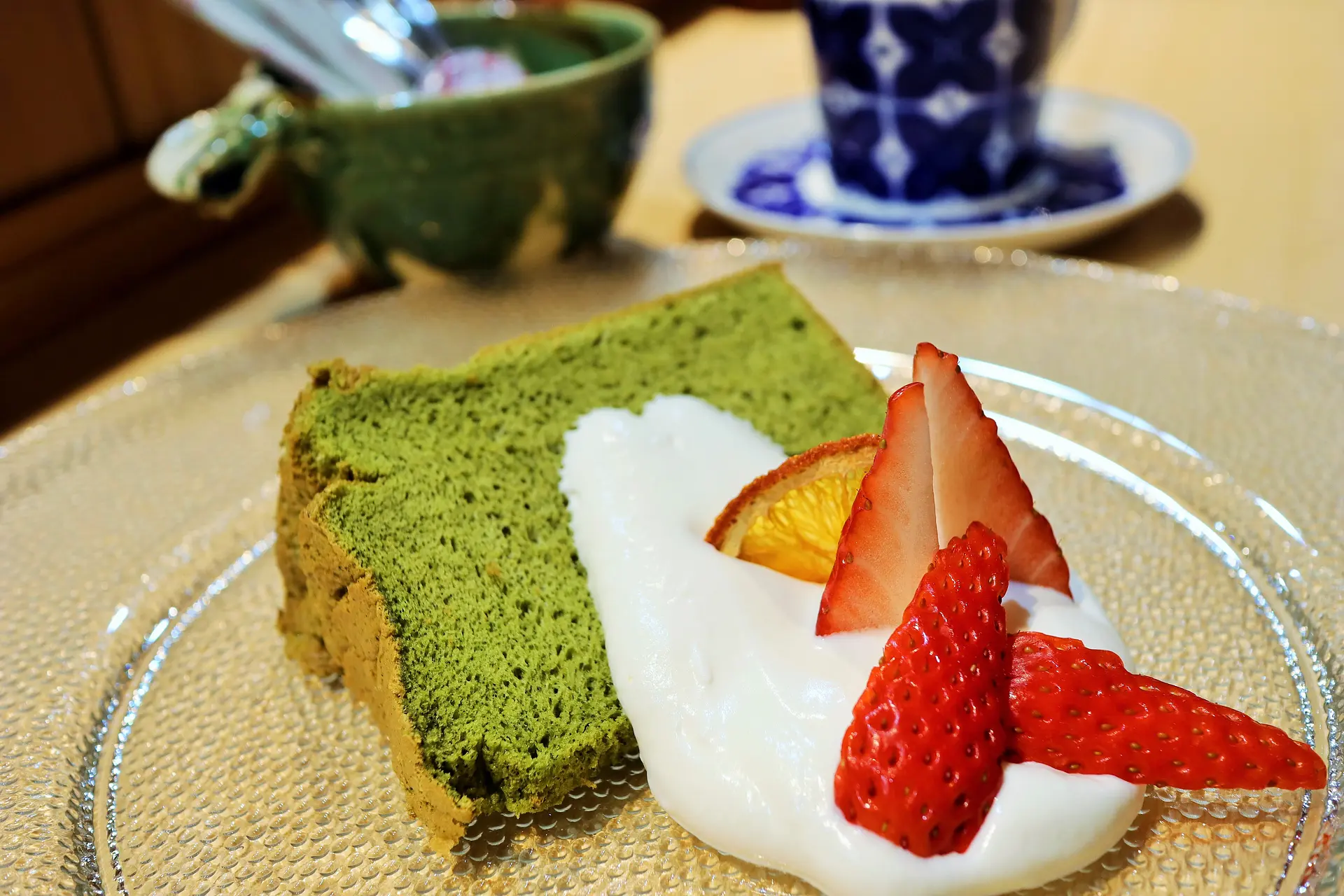 今回は抹茶のシフォンケーキ。なんと、デザートはオーナーの娘さんが担当とのこと!
