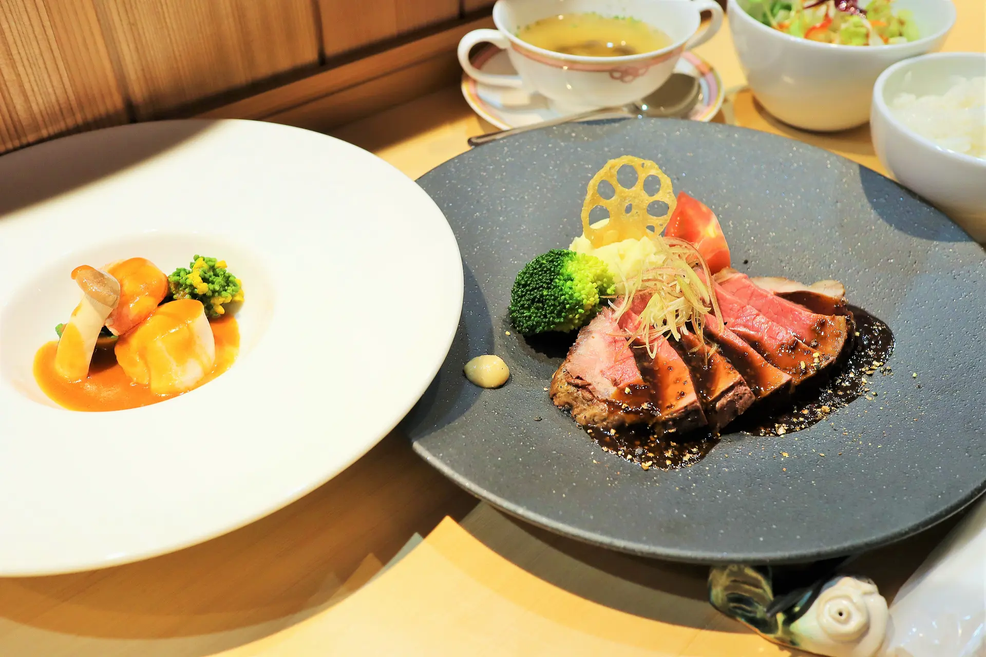 前菜は海の幸の白ワイン蒸し、そしてメインのローストビーフにスープ・サラダ・ライス・漬物がついてボリューム満点!