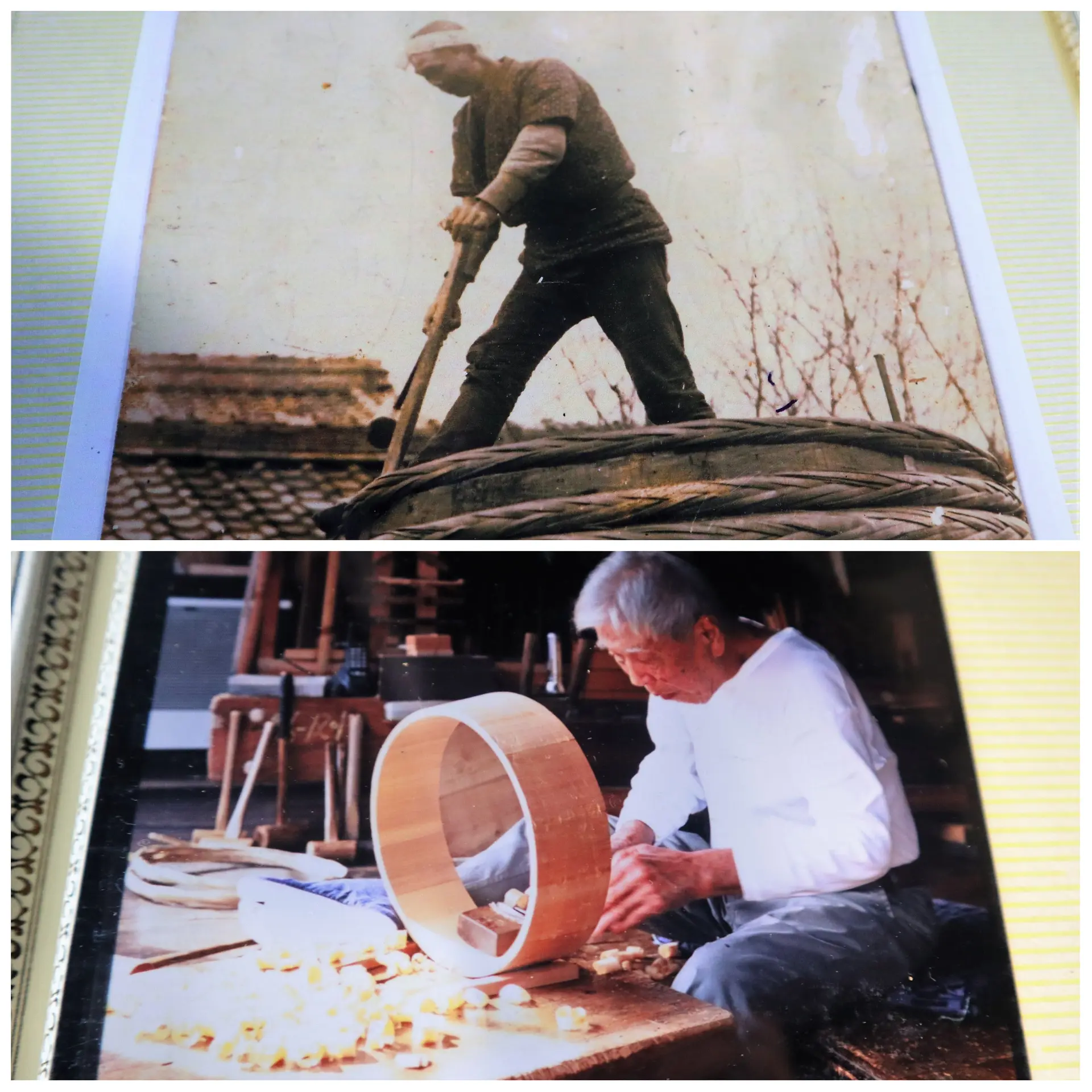大きな味噌桶を手掛けている作業風景です。これほど大きな桶であっても桶職人の手にかかれば、長く使える立派な桶に仕上がります。
