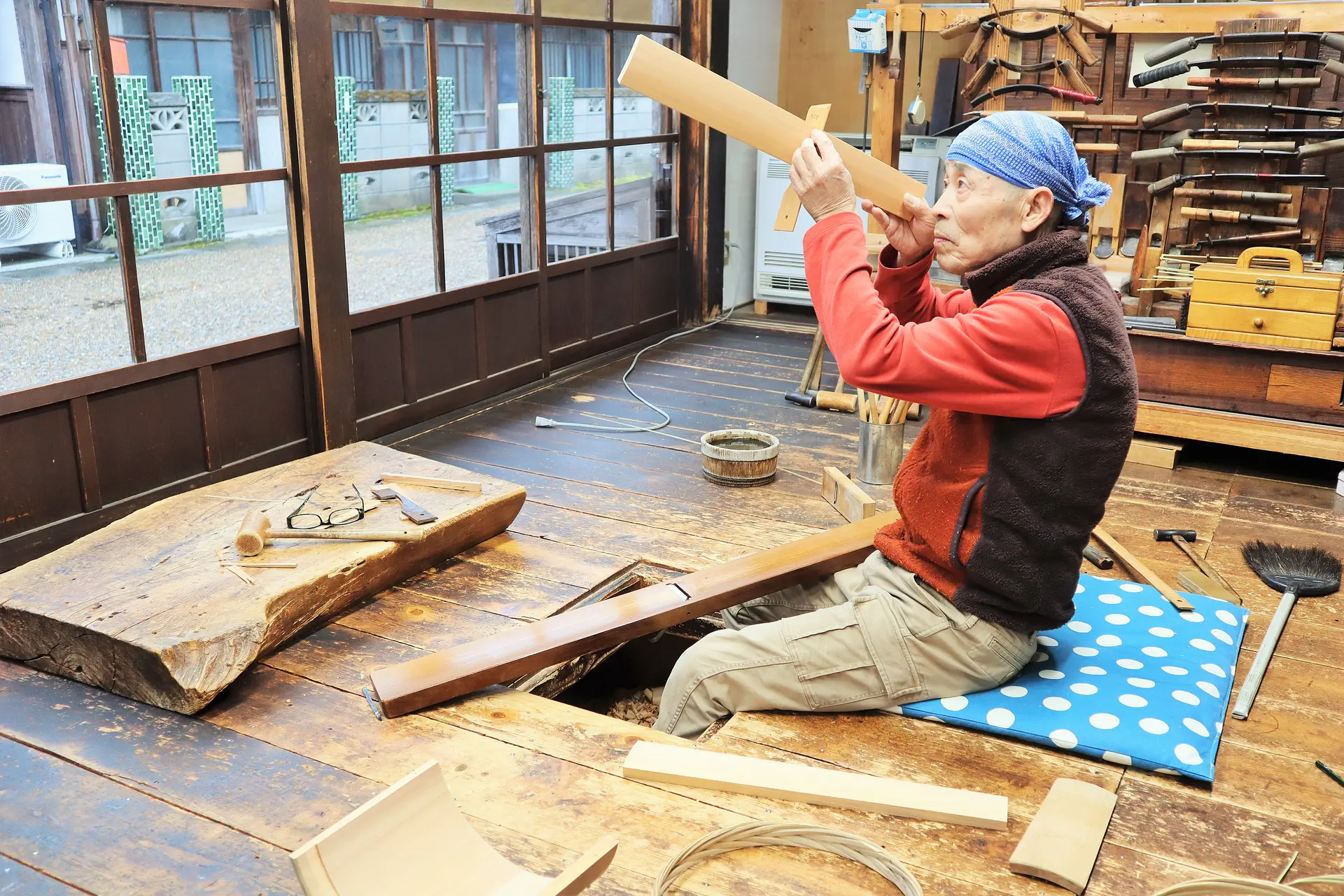 さまざまな工具を使い、職人技で曲がりの具合を見ながらカンナで形を整えていきます。
