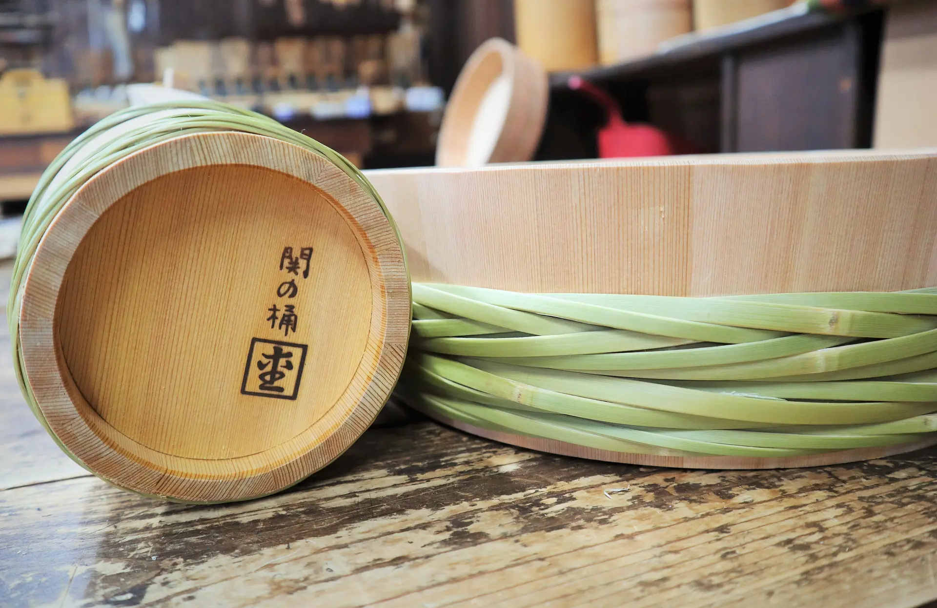 桶の材料は信州の椹(さわら)・杉・高野槙(こうやまき)といった木を、桶の種類に合わせて使っているとのこと。
