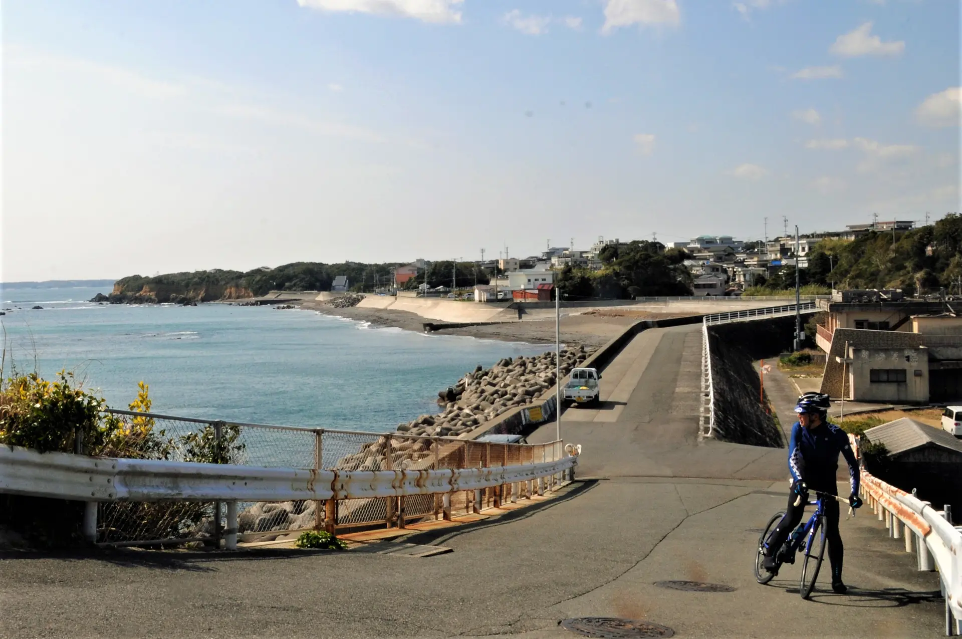 次の目的地、大王埼灯台はもうすぐです。大王埼灯台には自転車では近くまで行けないので、今回は灯台の北側の堤防道路まで自転車で行って遠目から眺めました。