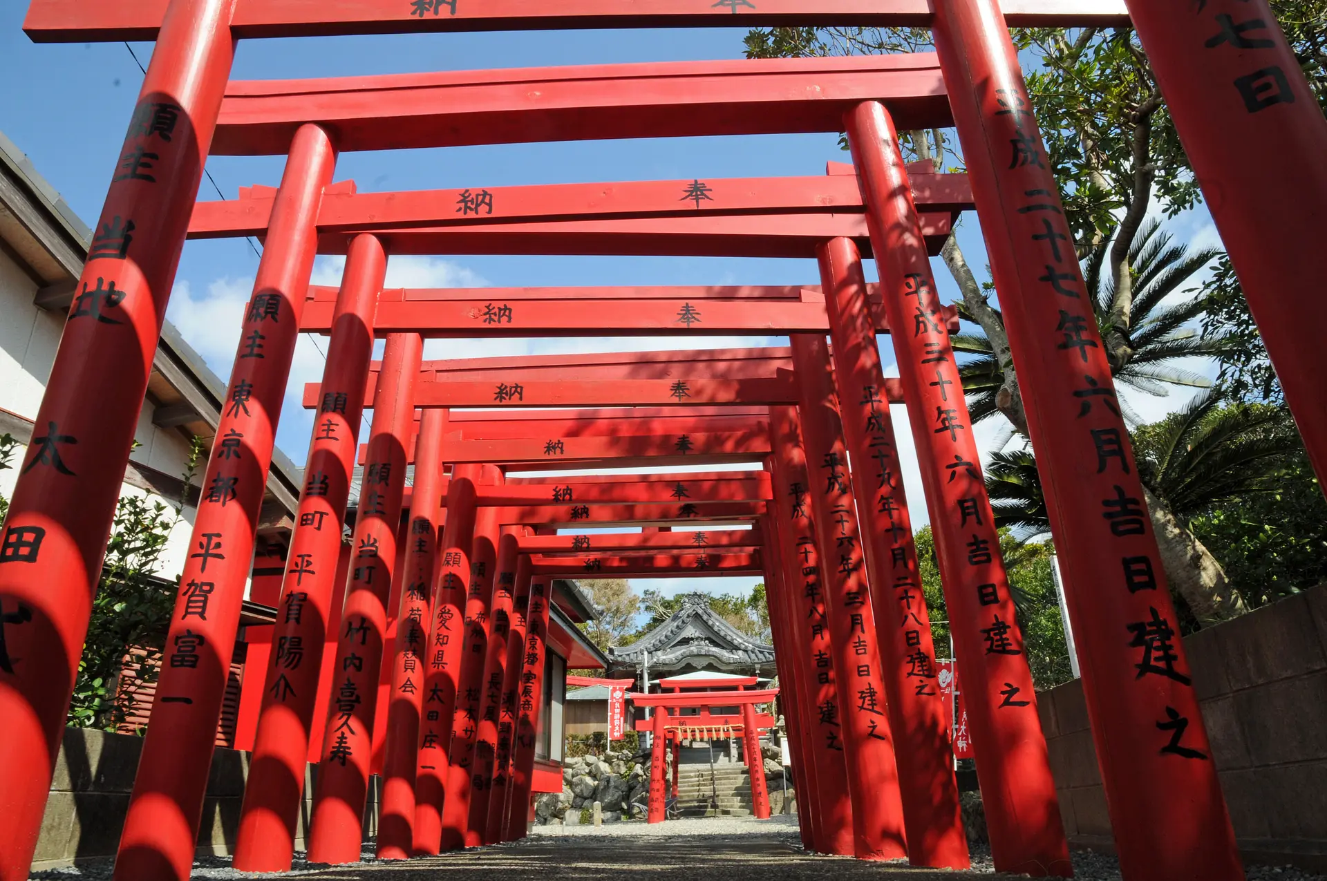 いくつも立ち並ぶ朱色の鳥居が青空に映えるさまは必見です。本殿には絵天井もあります。