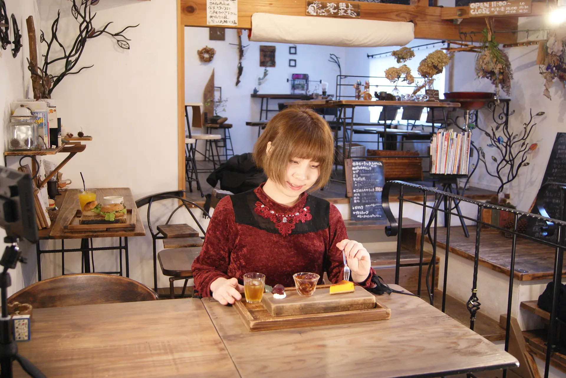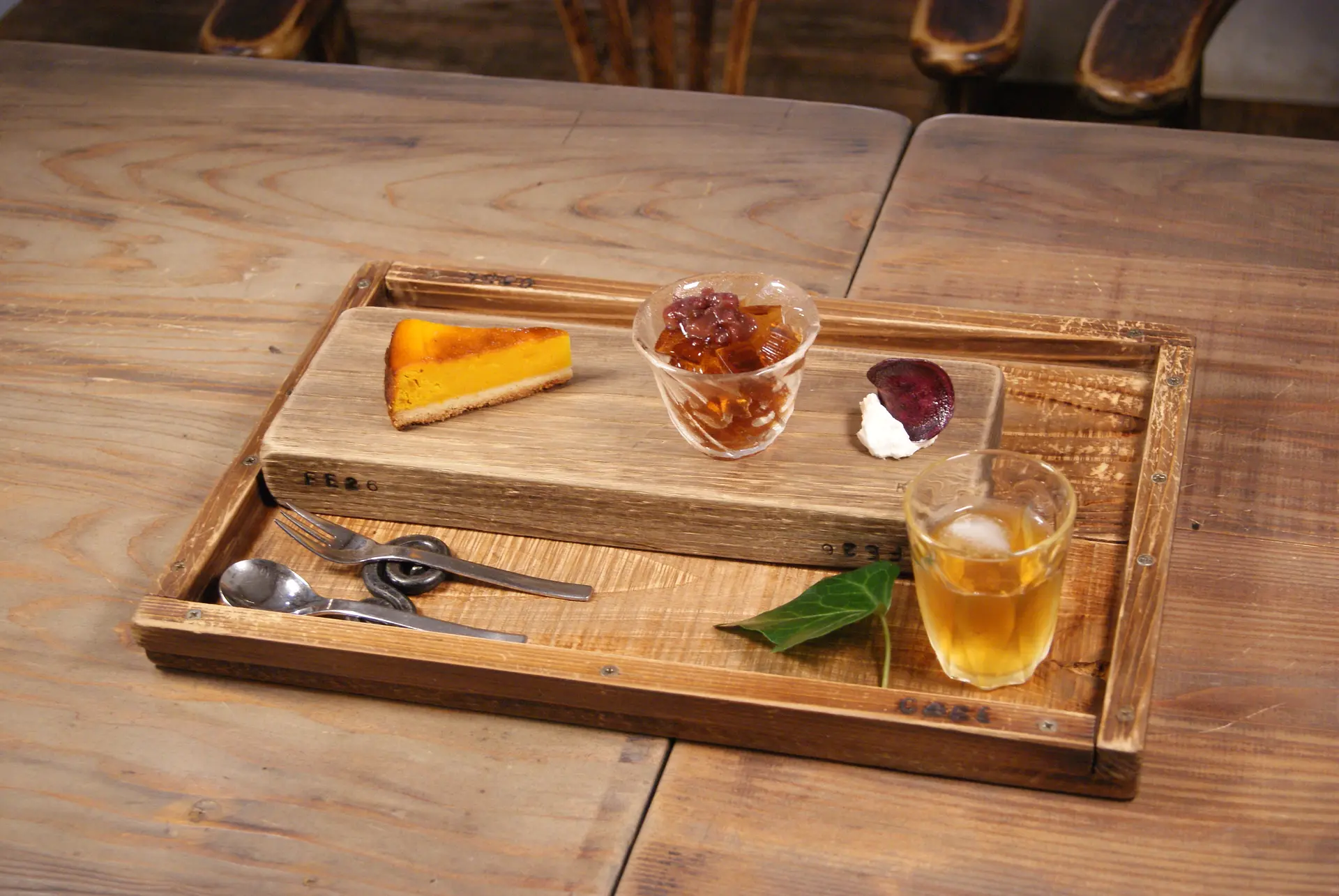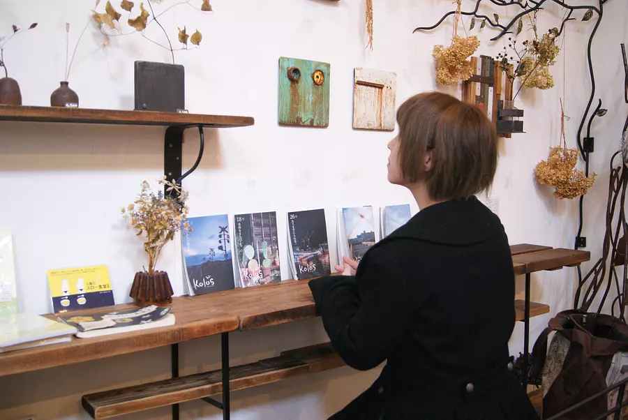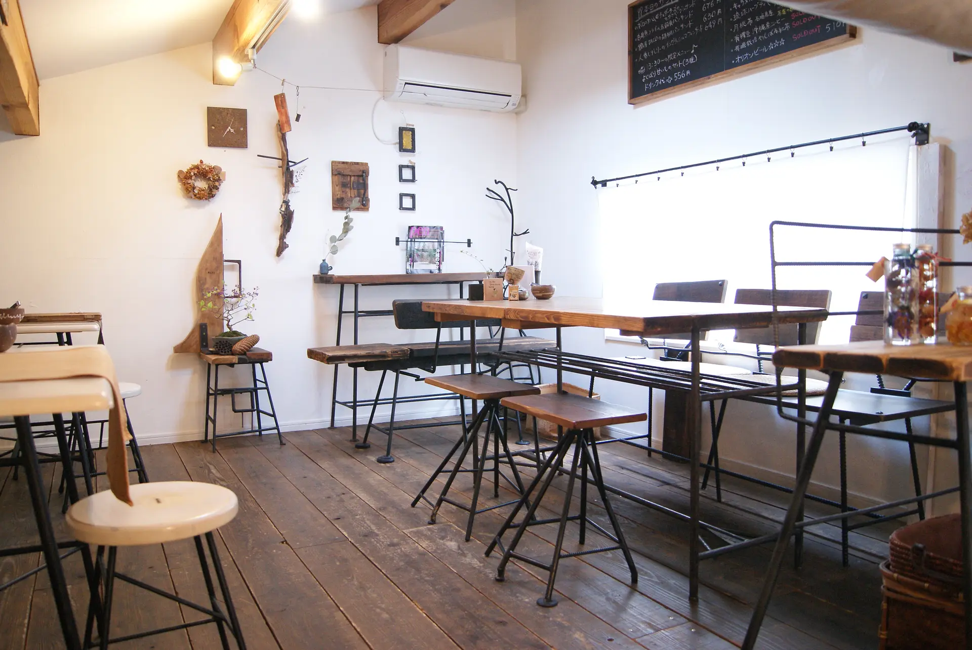 カフェスペースのテーブルや椅子も、すべて今岡さんの手づくり。写真に収めたくなるほど、個性的なデザインです。