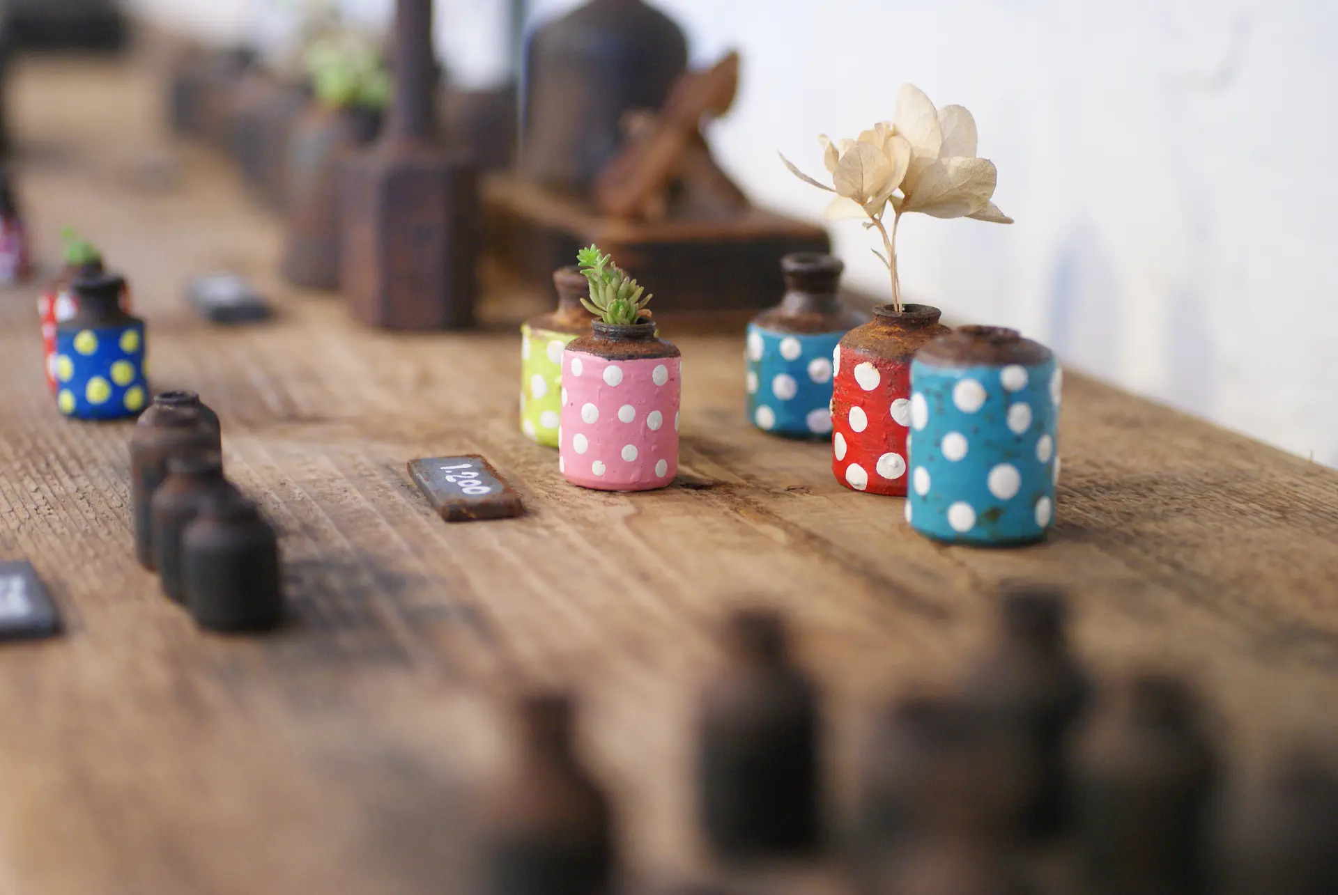 棚はもちろんのこと、置いてあるテーブルや椅子もすべて手づくり。店内の所々にあるオブジェも独創性があり、ステキなものばかりです。