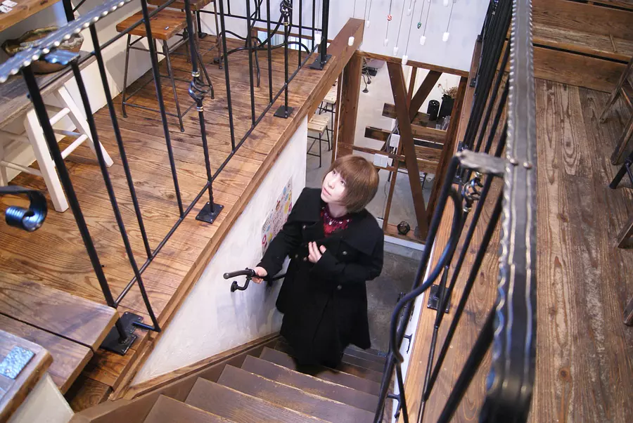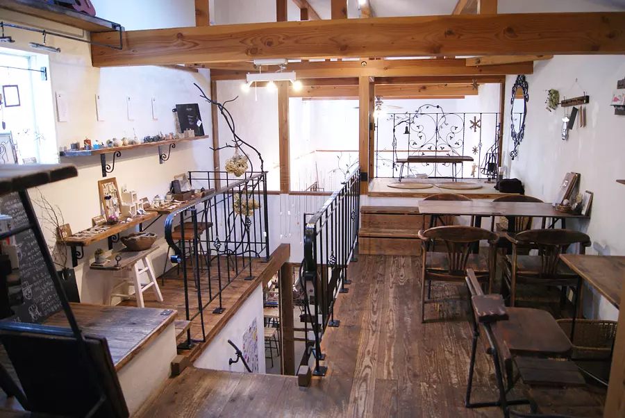 次は、2階のカフェに行ってみましょう。アンティークな風合いの手すりなど、店内の一つひとつのこだわりに心がワクワク。