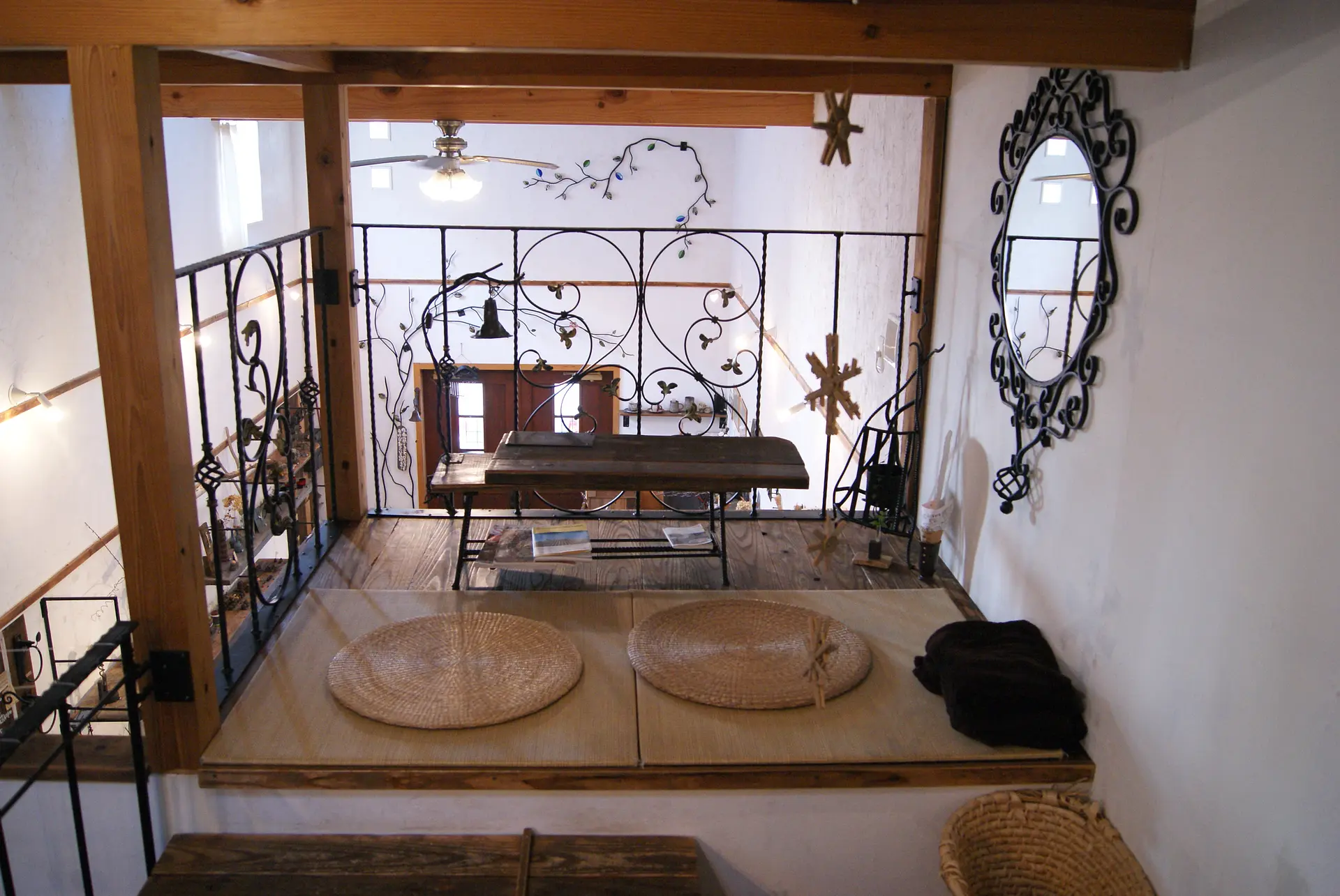 2階の一角には、座敷席も!和の趣を感じる空間の中に、アンティーク調のテーブル。おもしろい組み合わせですが、手すりや壁に飾られたインテリアの統一感もうまく作用し、見事に調和しています。この席は若いカップルに人気!