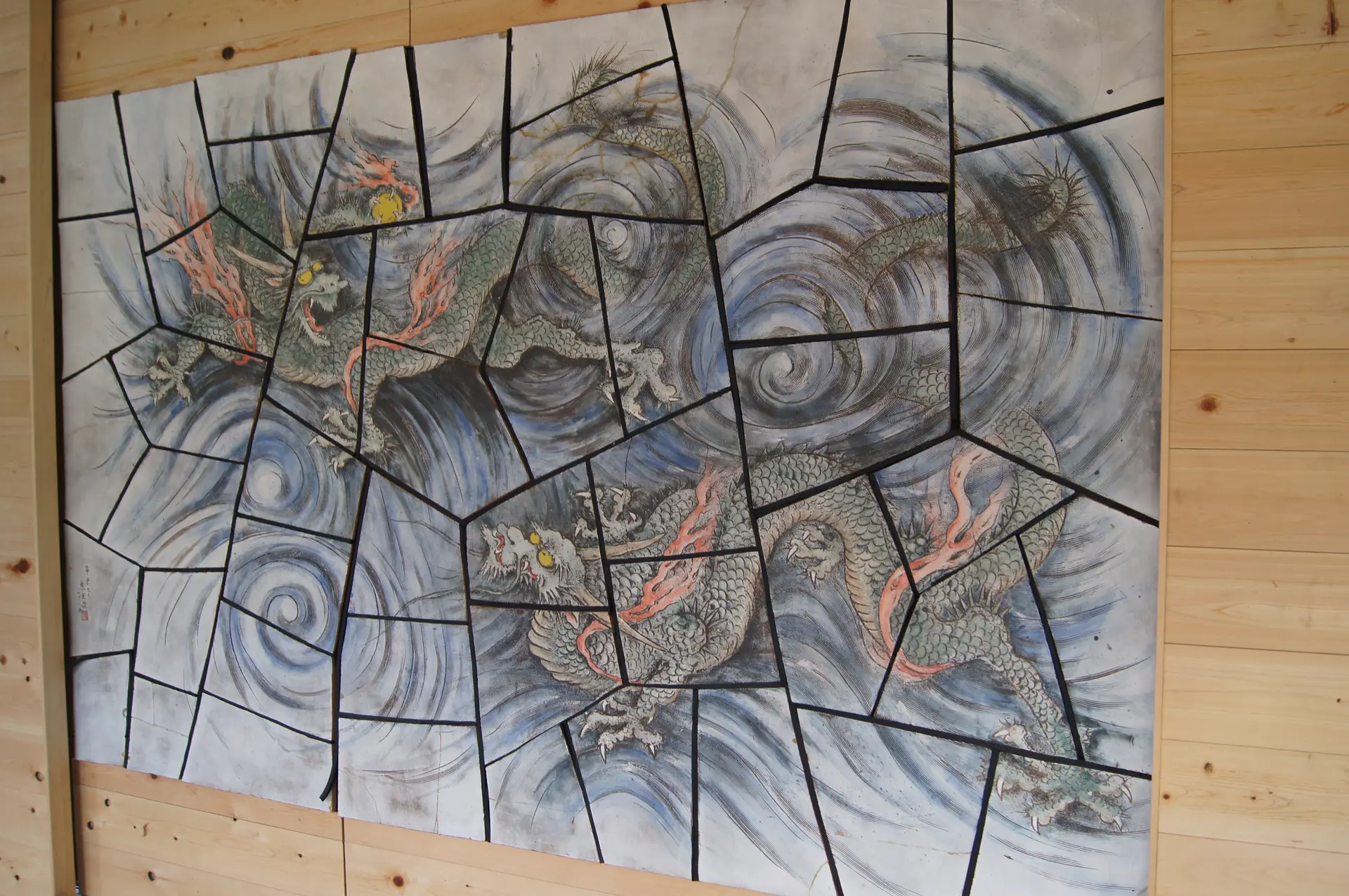一見すると壁に描かれた絵のように見えますが、近づいてみると全て陶器に彫られて描かれていることがわかります。躍動感あふれる龍の姿に惚れ惚れします。