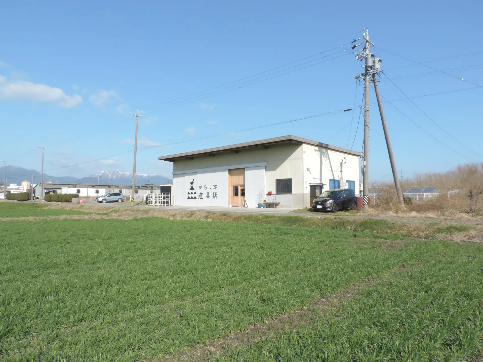 取材当日は快晴!車で「かもしか道具店」を探していると、田んぼの真ん中に建つお店を発見。素朴でシンプルなイメージの外観です。