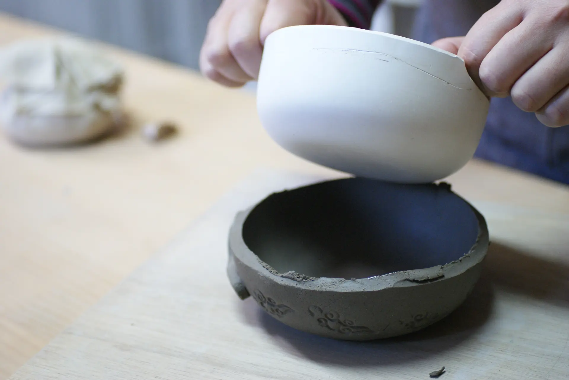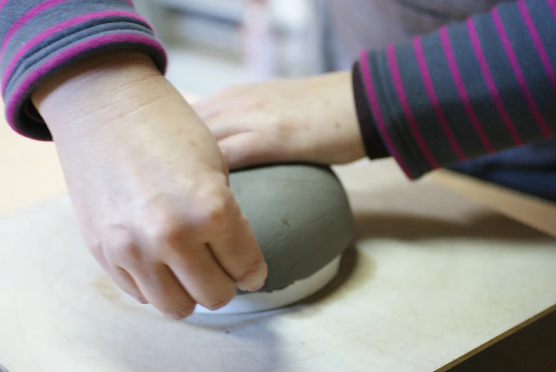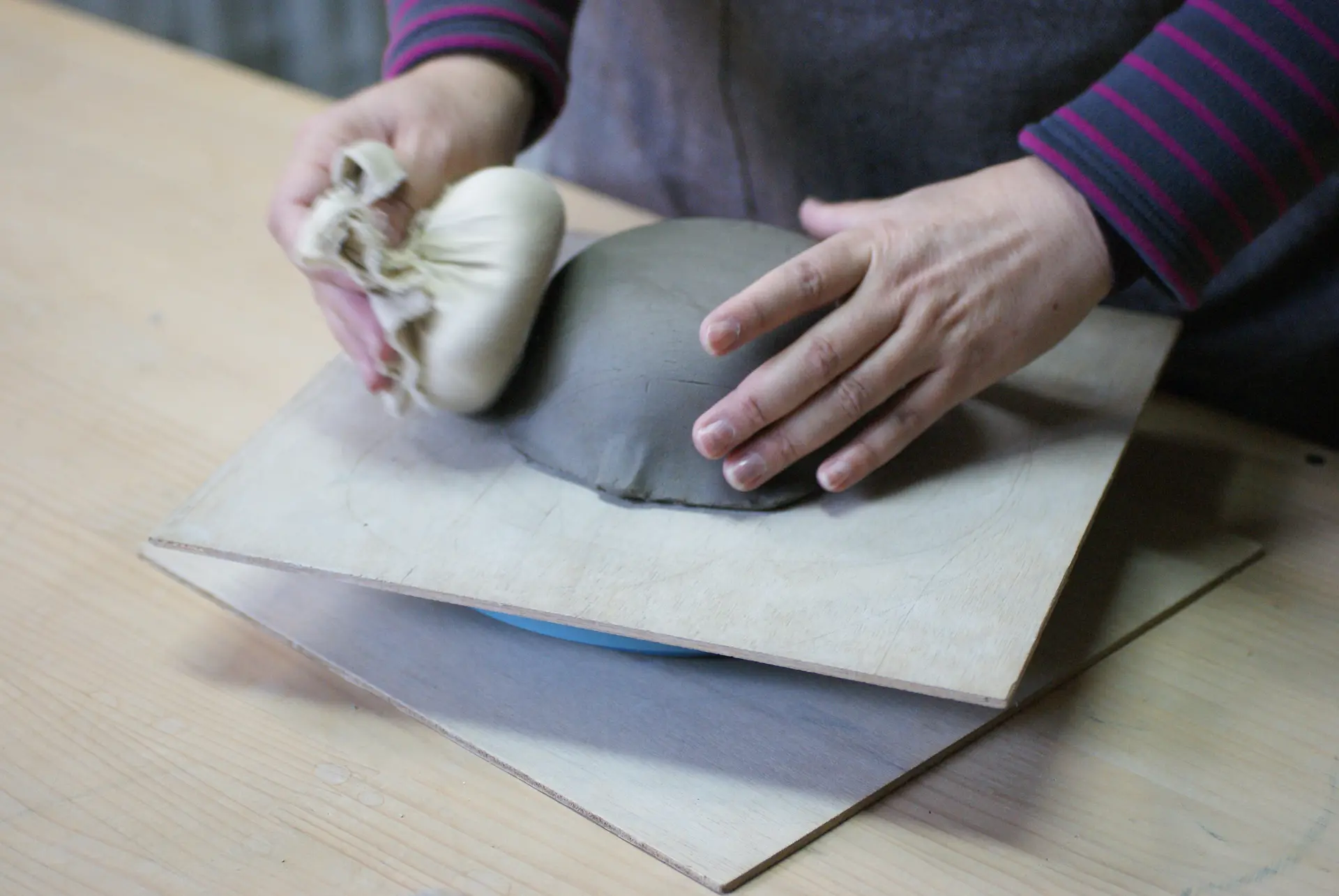 体験は、形を選んで石膏型に粘土の板を押し付けて形をつくる「たたら成形」を行っています。