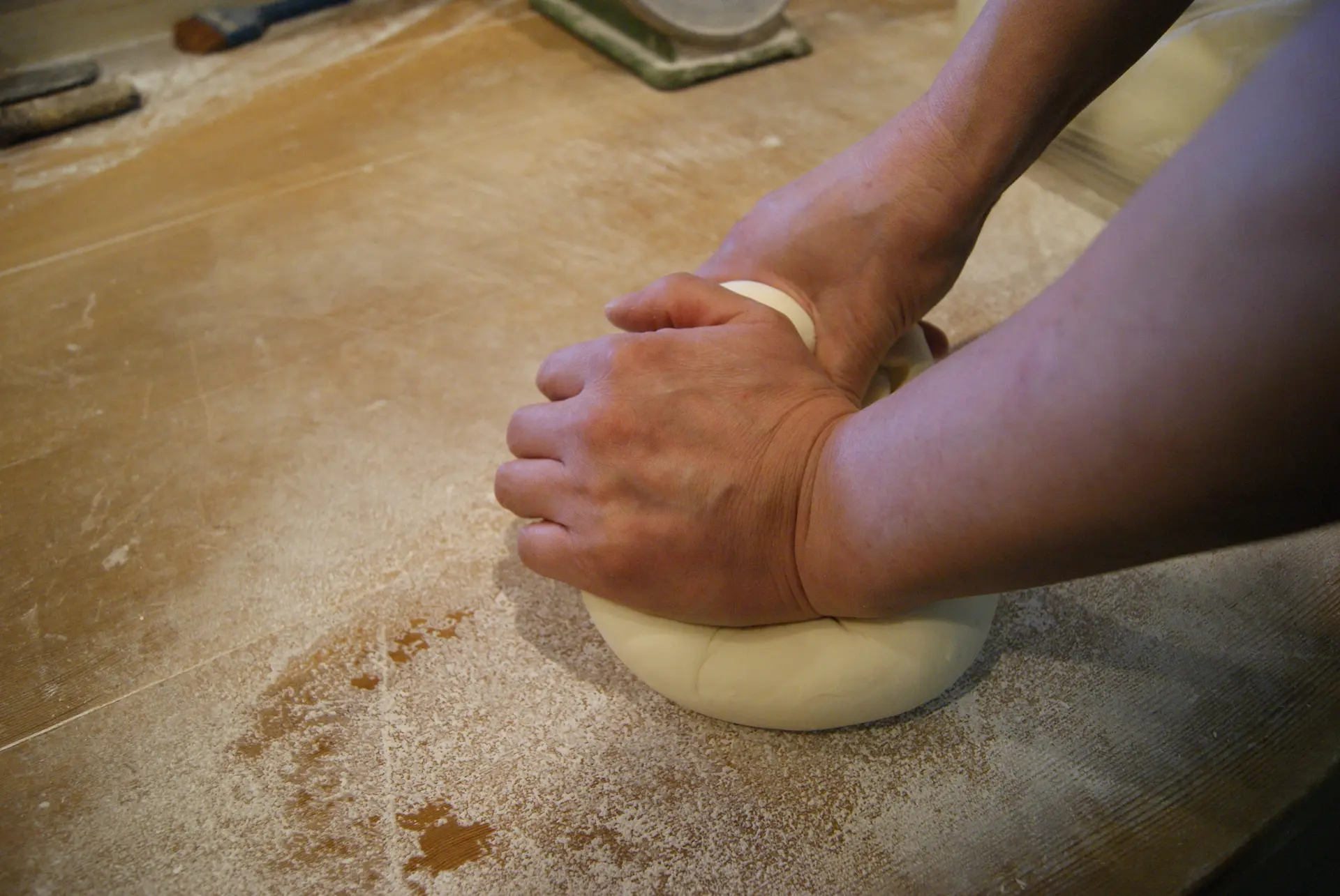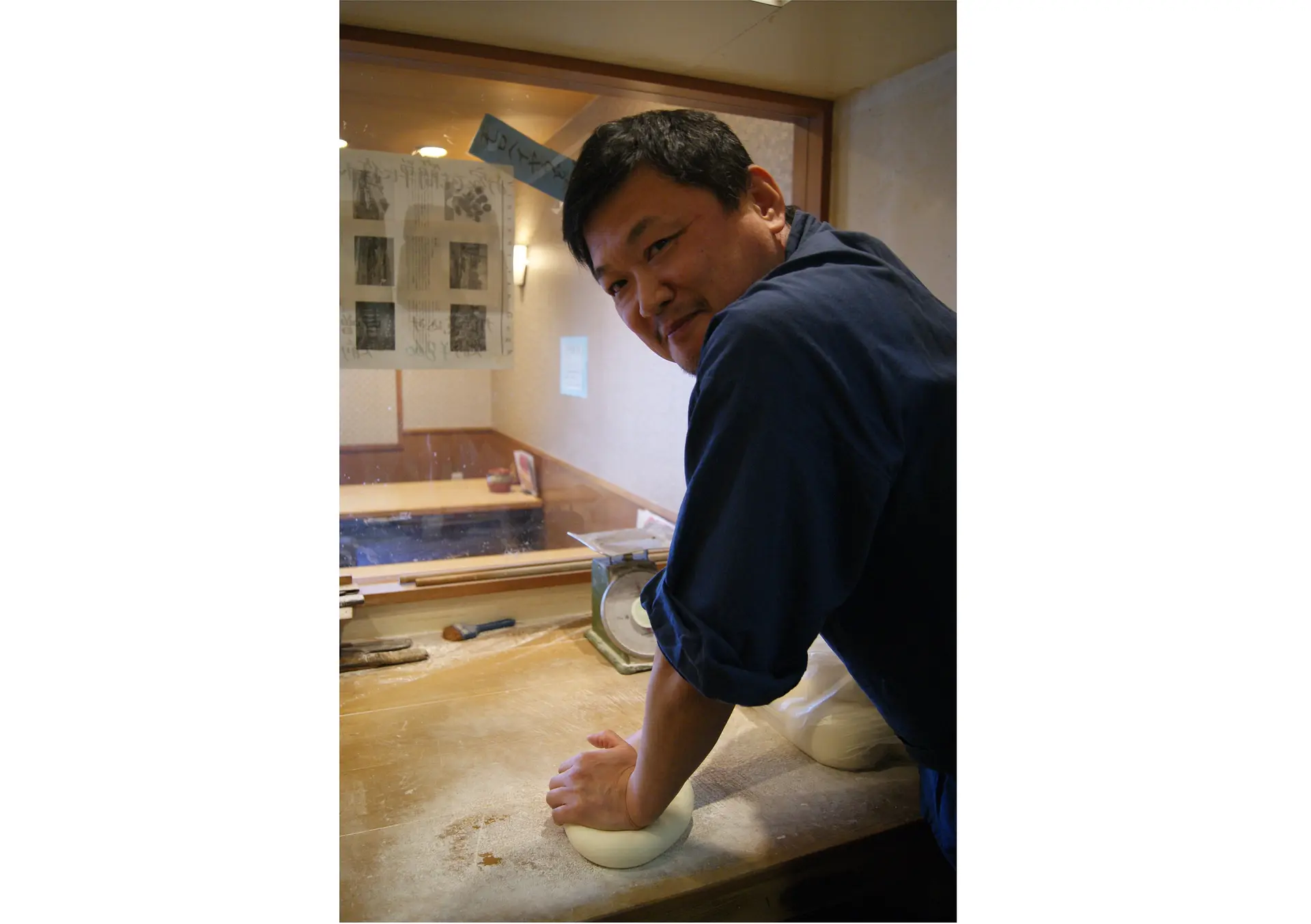 お店の一角にはガラス張りの製麺コーナーがあり、運が良ければ店長さんが仕込みをしている様子を見ることができるかも。力強く打ち出される生地の仕込みの風景は見応えがあります。