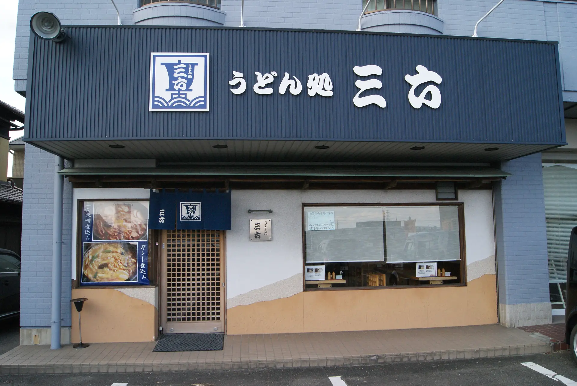 桑名インターチェンジから約10分ほどで、「うどん処 三六」に到着。藍色をベースにした建物のデザインが、昔ながらの粋を感じさせます。