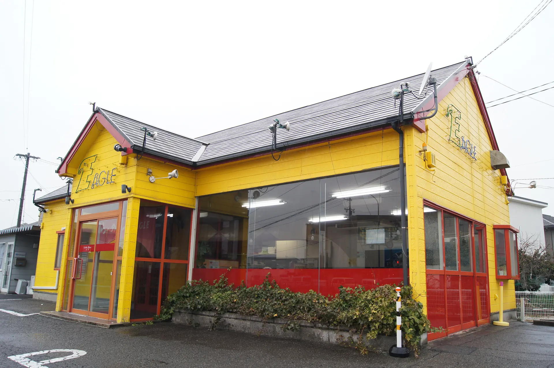 「うどん処 三六」から車で1分ほど、徒歩にすると数分ほどの距離に、黄色い建物が印象的な「らーめんEAGLE」を見つけました!お店への入り口は道路沿いではなく、一旦信号を曲がったところにあります。