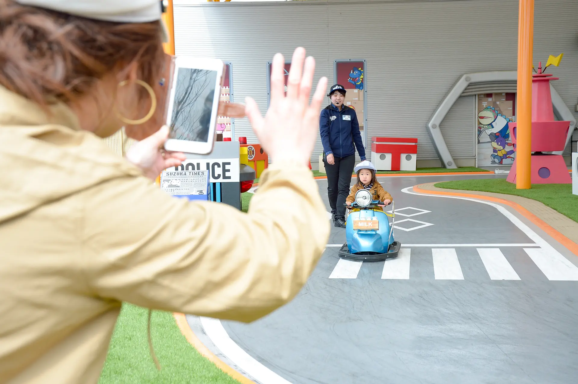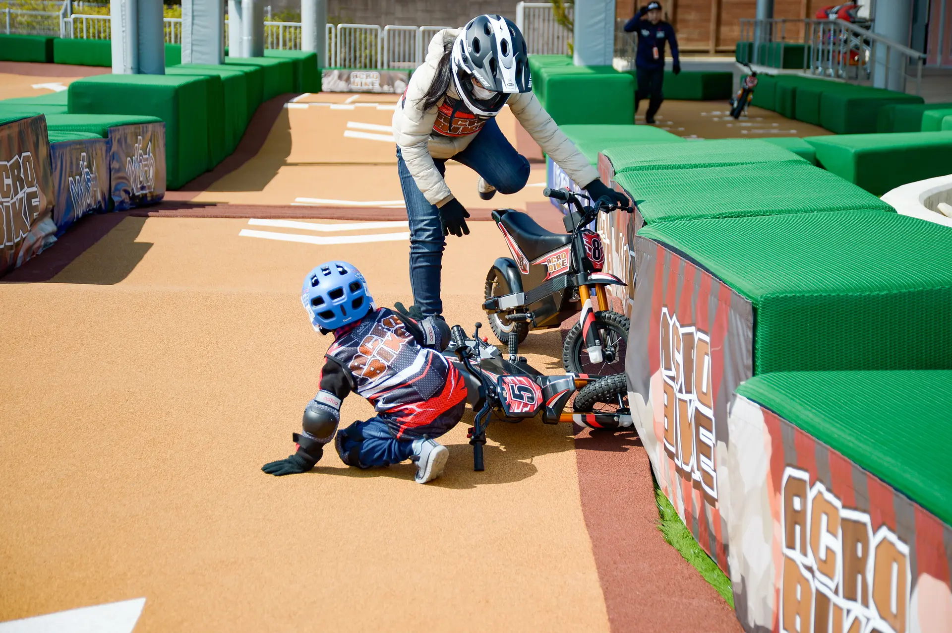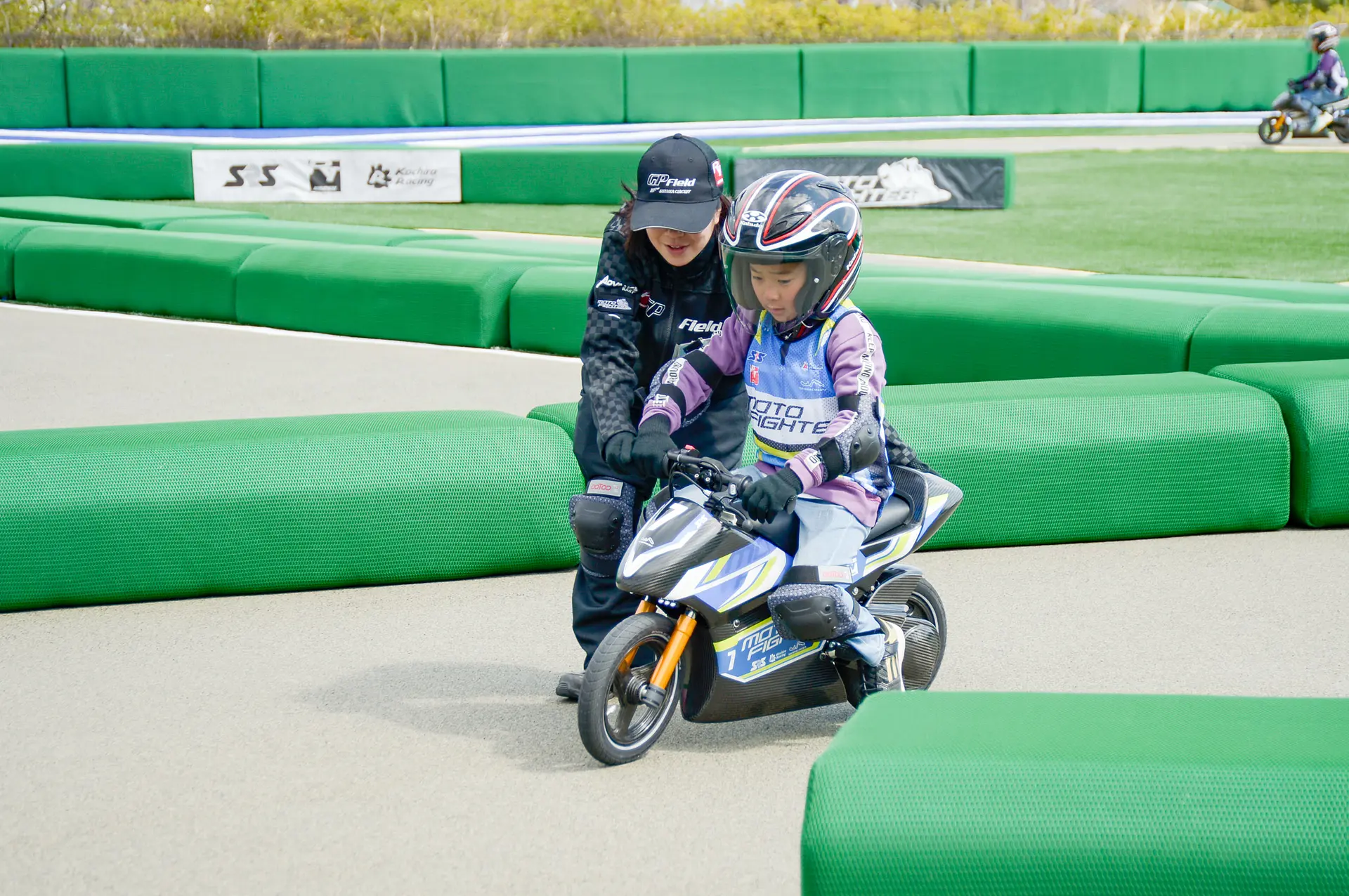 バイクは小型で軽量、小さな子も操縦がしやすく、練習コースでスタッフさんがマンツーマンで基本操作を教えてくれます。