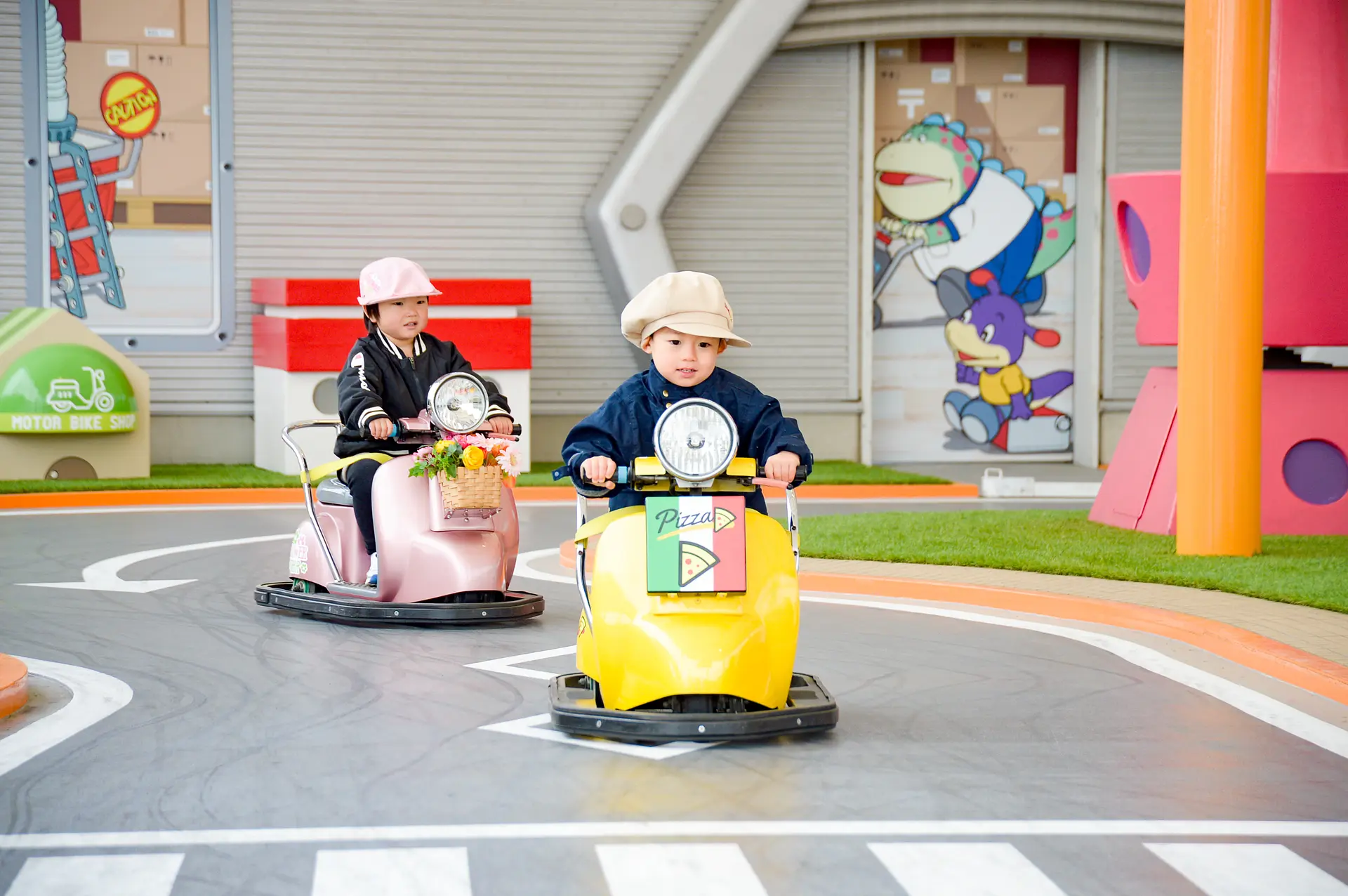 「ピンキーバイクプラス」は、お花屋さんやピザ屋さん、郵便屋さんなど、おしごとをモチーフにしたかわいらしいバイクに乗ってコースを周遊できるアトラクション。