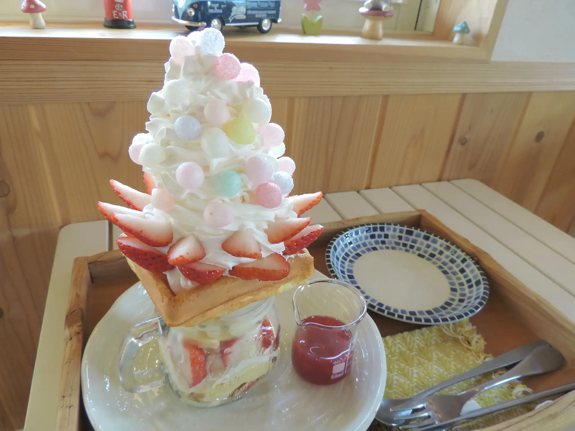 季節のフルーツと2種類のアイス、ワッフルと甘い幸せがうず高く積まれたパフェ。どうやって食べようか迷っていると…。