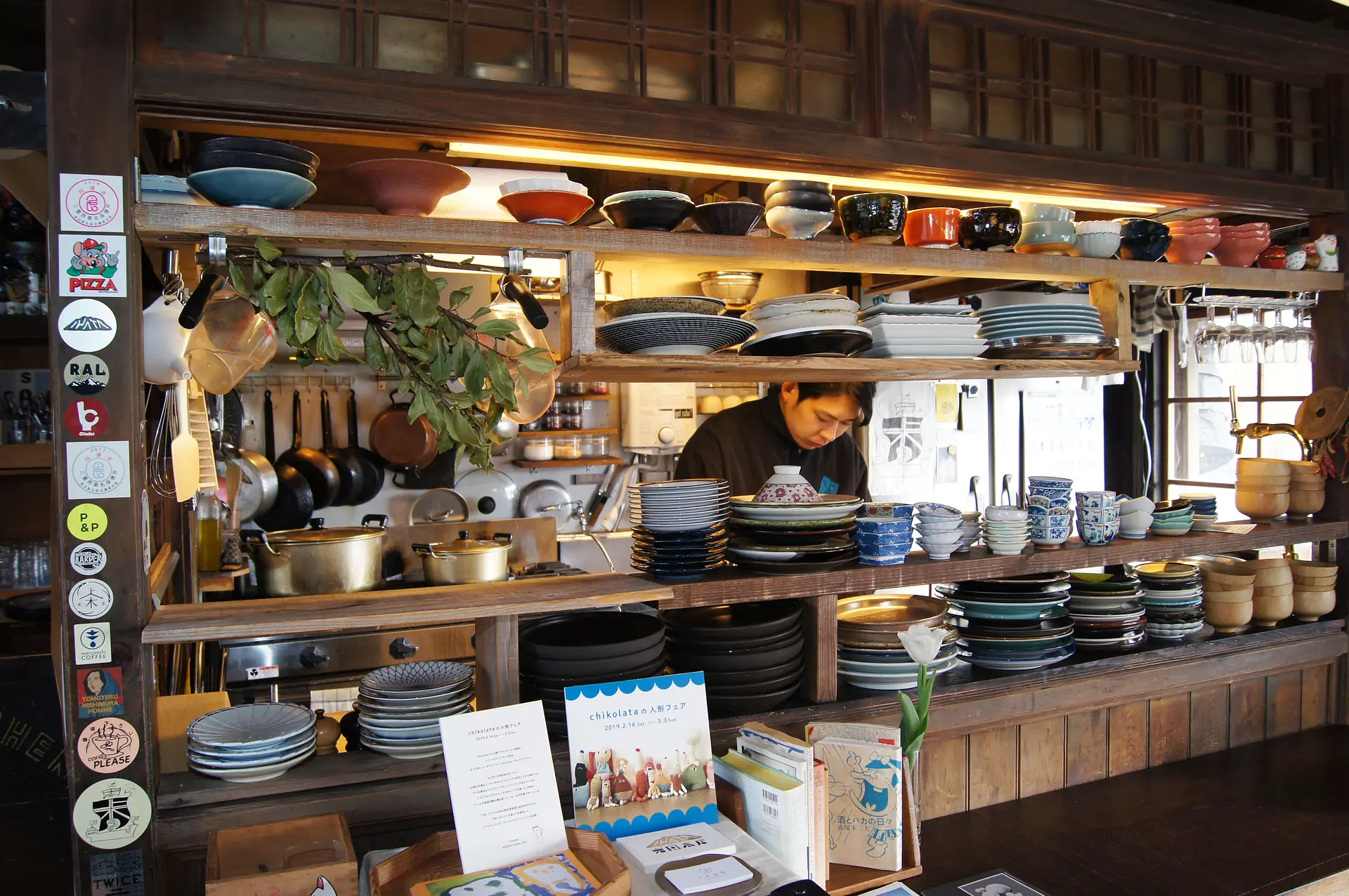 調理場はオープンキッチンになっており、カウンターから調理風景を見ることができます。カウンターに並べられた器のディスプレイもおしゃれで、見ていると気持ちが華やぎます。