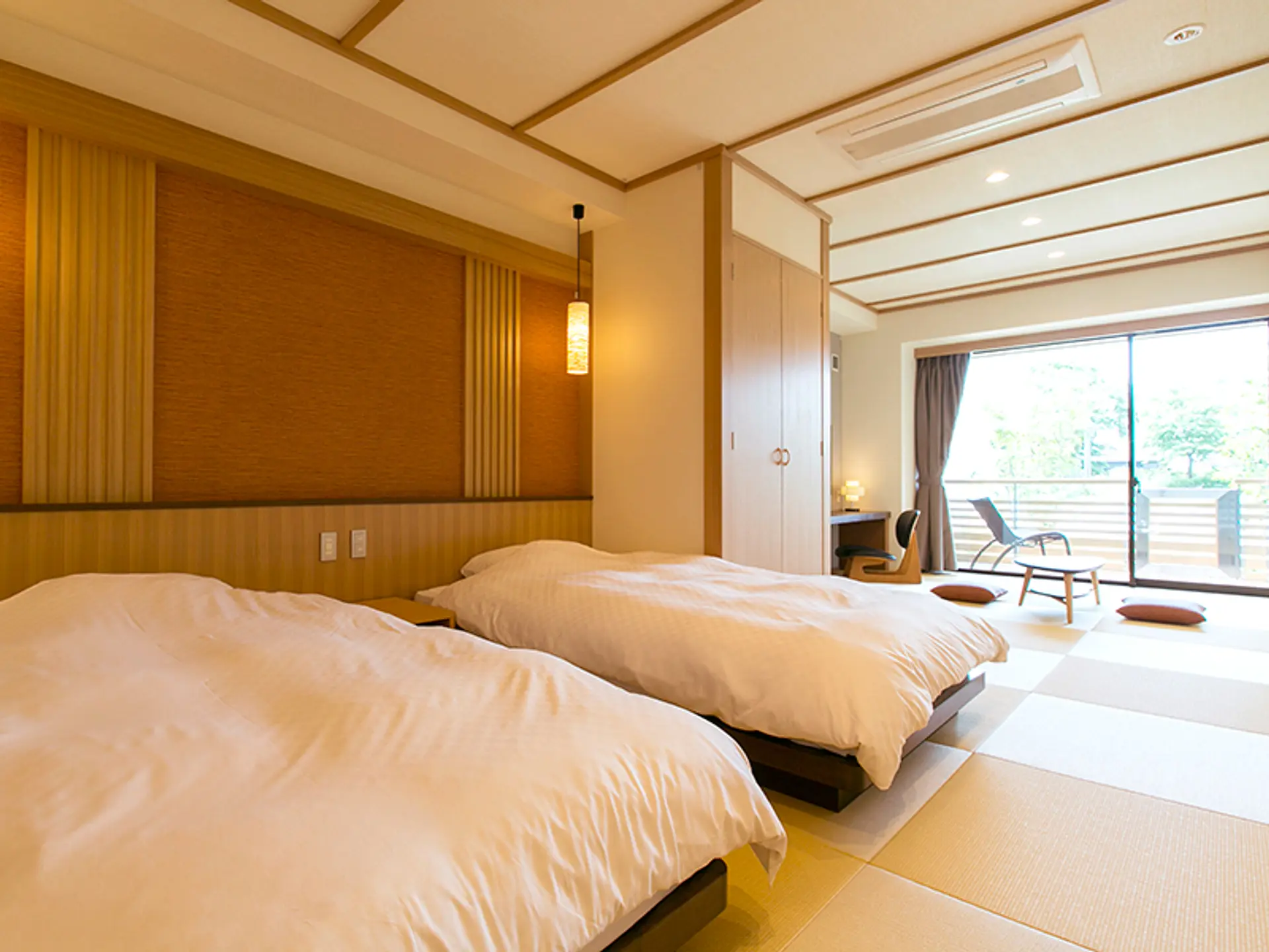 2015年に改装されたばかりのお部屋はきれいで、畳のリビングにベッドと、和と洋が絶妙に組み合わさった空間。広々としたスペースで思いっきりのんびりできます♪