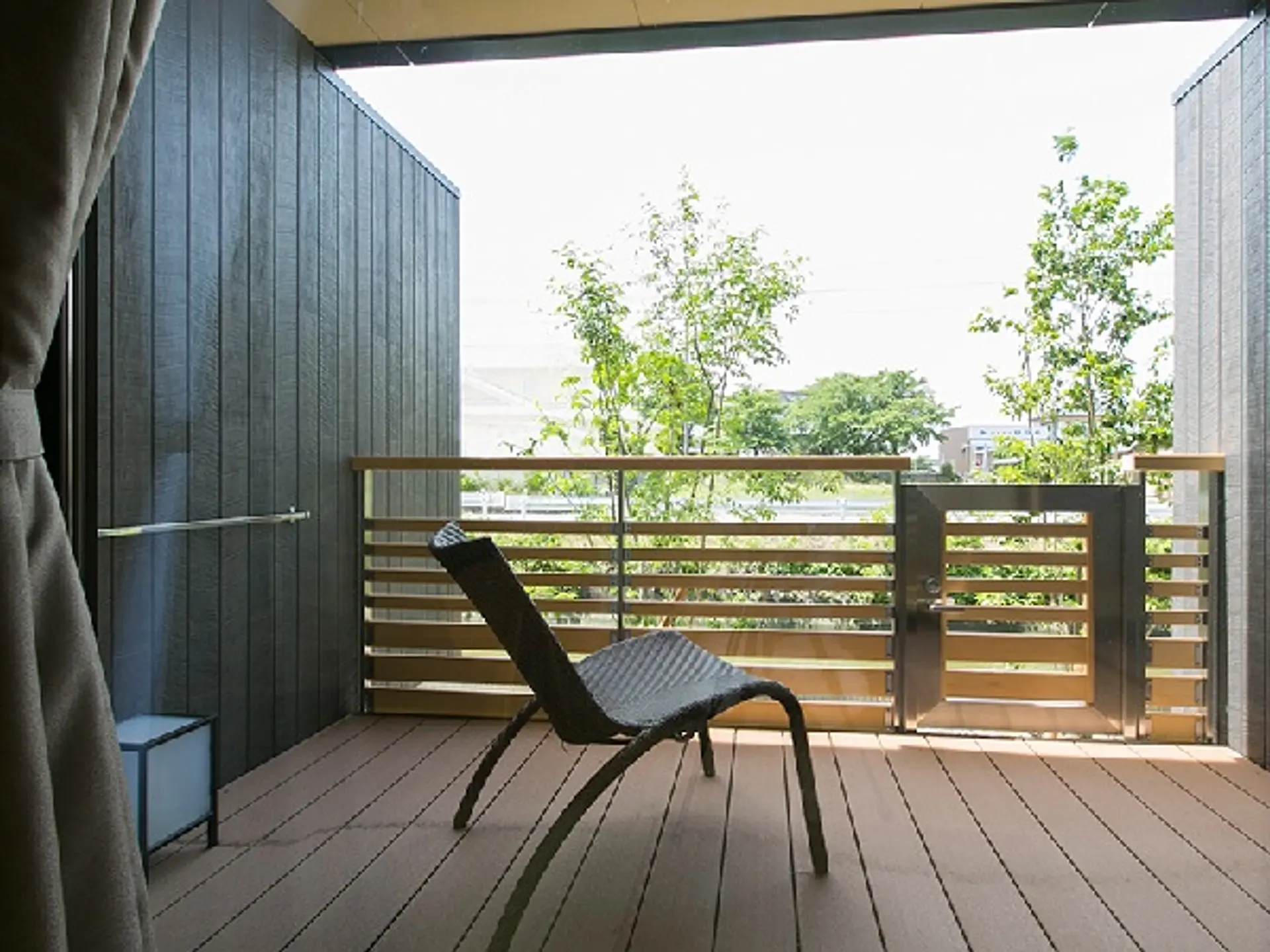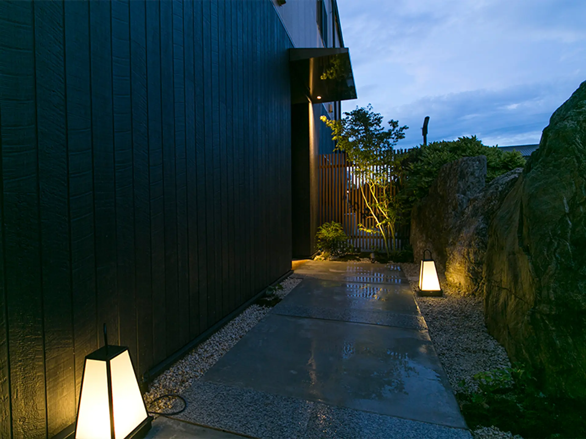 この屋外通路をはじめ、館内にある中庭は愛知県のエクステリアショップ「ニュートラル」を経営する赤川俊和さんの設計。和モダンな美しさを感じるお庭の造形を是非ご覧あれ♪