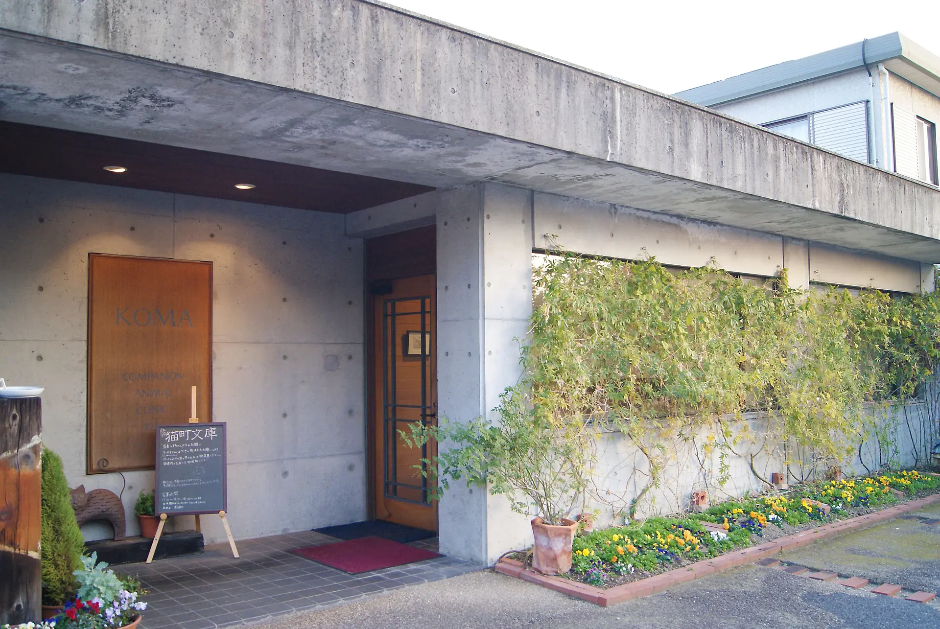 「コマ動物病院」の院長が、「動物病院の隣にカフェを開きたい」という思いからオープンしたお店です。整備された花壇の上に、グリーンカーテンが張り巡らされた外観は、ナチュラルな雰囲気。玄関を入ると、左側に「コマ動物病院」の入口があり、正面にカフェ「猫町文庫」の入口があります。