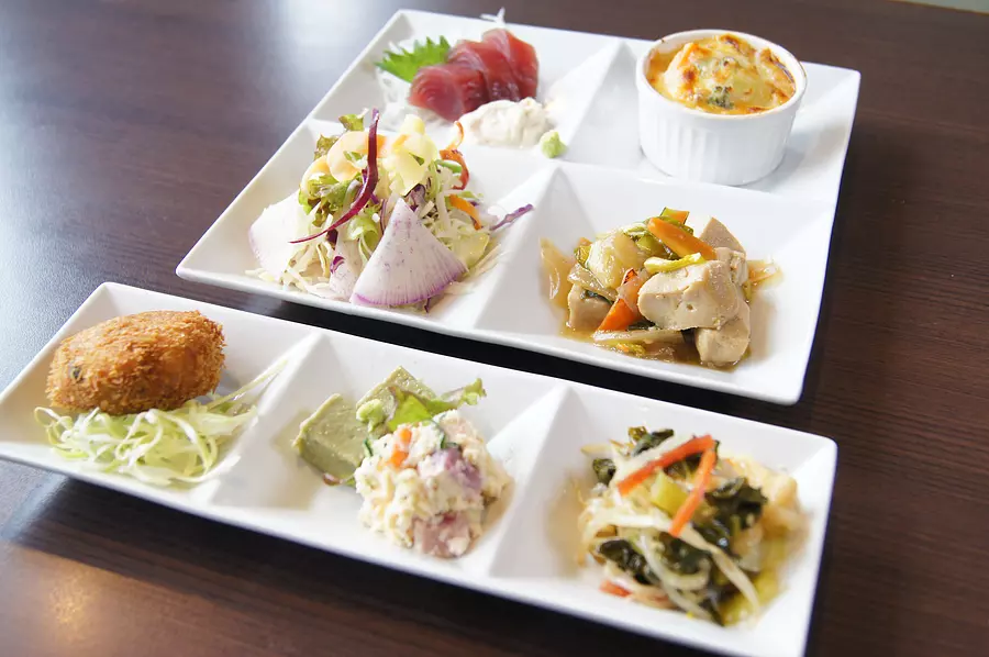 「ベジキューブランチ」はお刺身をはじめ、豆乳を使ったグラタンやサラダやおからコロッケ、豆乳胡麻豆腐などが並び、こちらもドリンク・デザート付き。それを、この価格で楽しめるのだから人気なのもうなずけます。