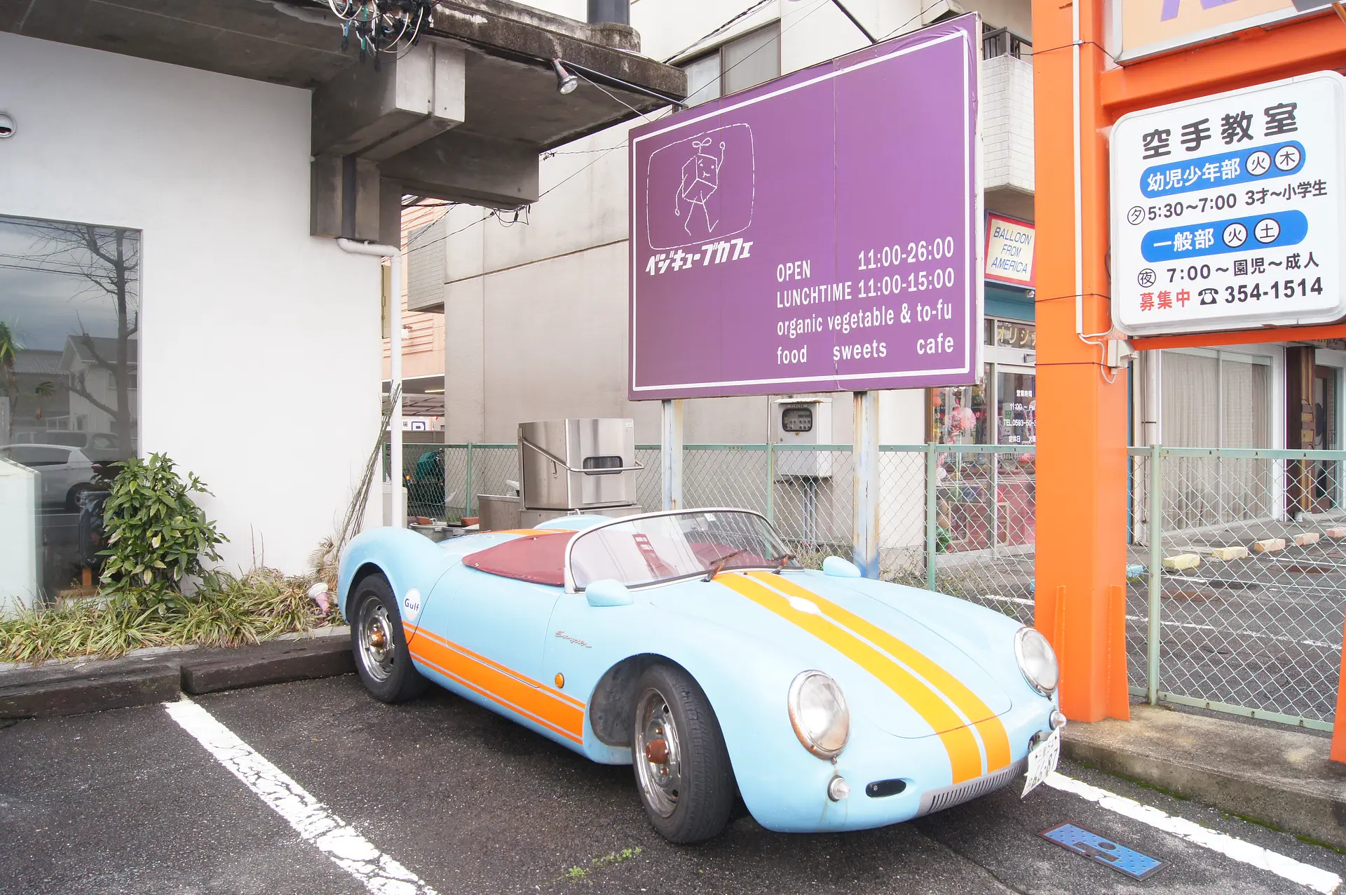 年代物のオープンカーを見ると、お店に入る前のワクワク感がアップ。