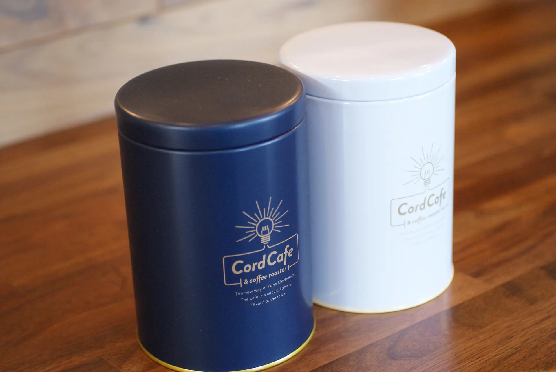 オリジナル缶持参でコーヒー豆50円引き。「ネイビー」もかっこいいけど、お店のロゴが絶妙に溶け込んだ「白」にも惹かれます。