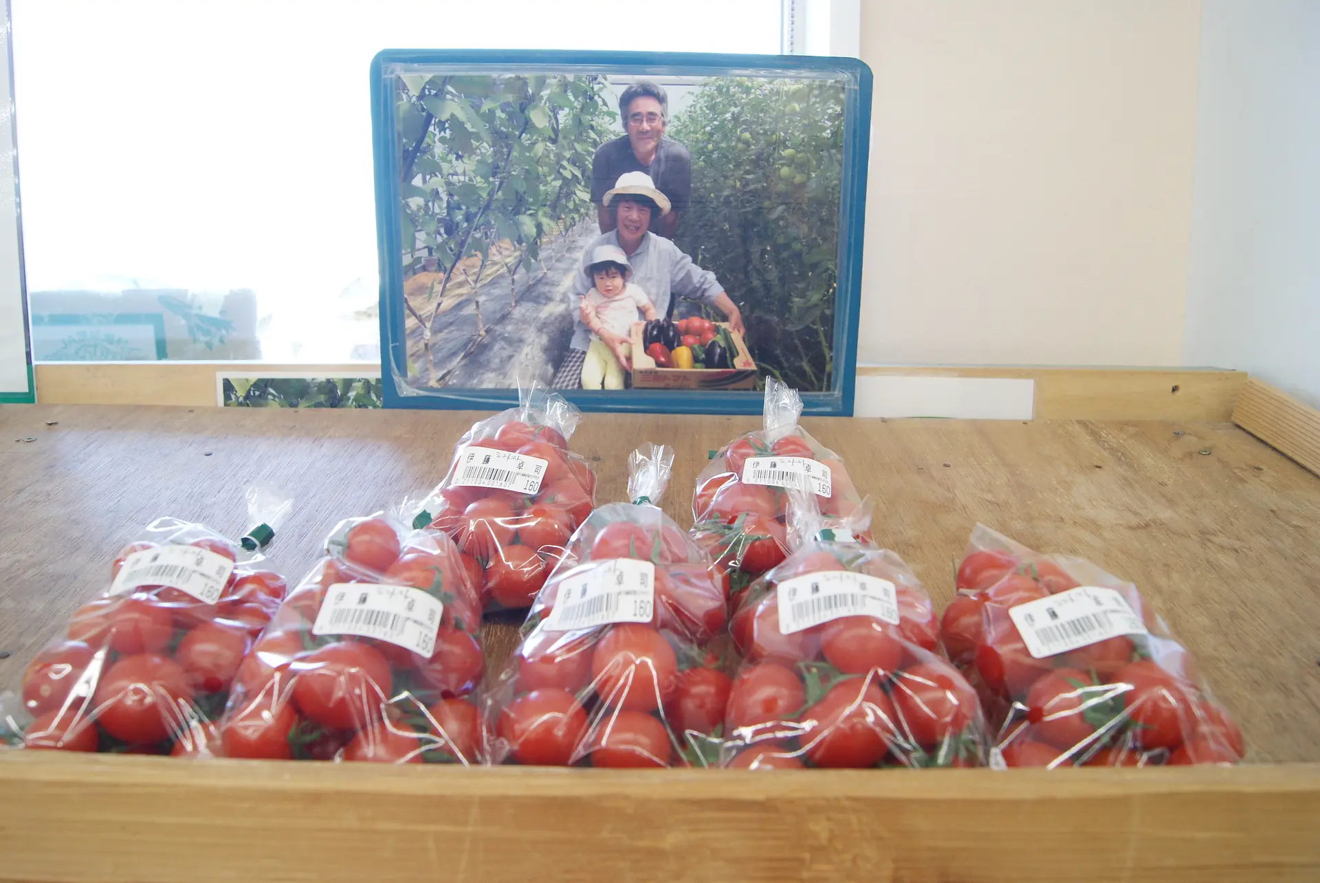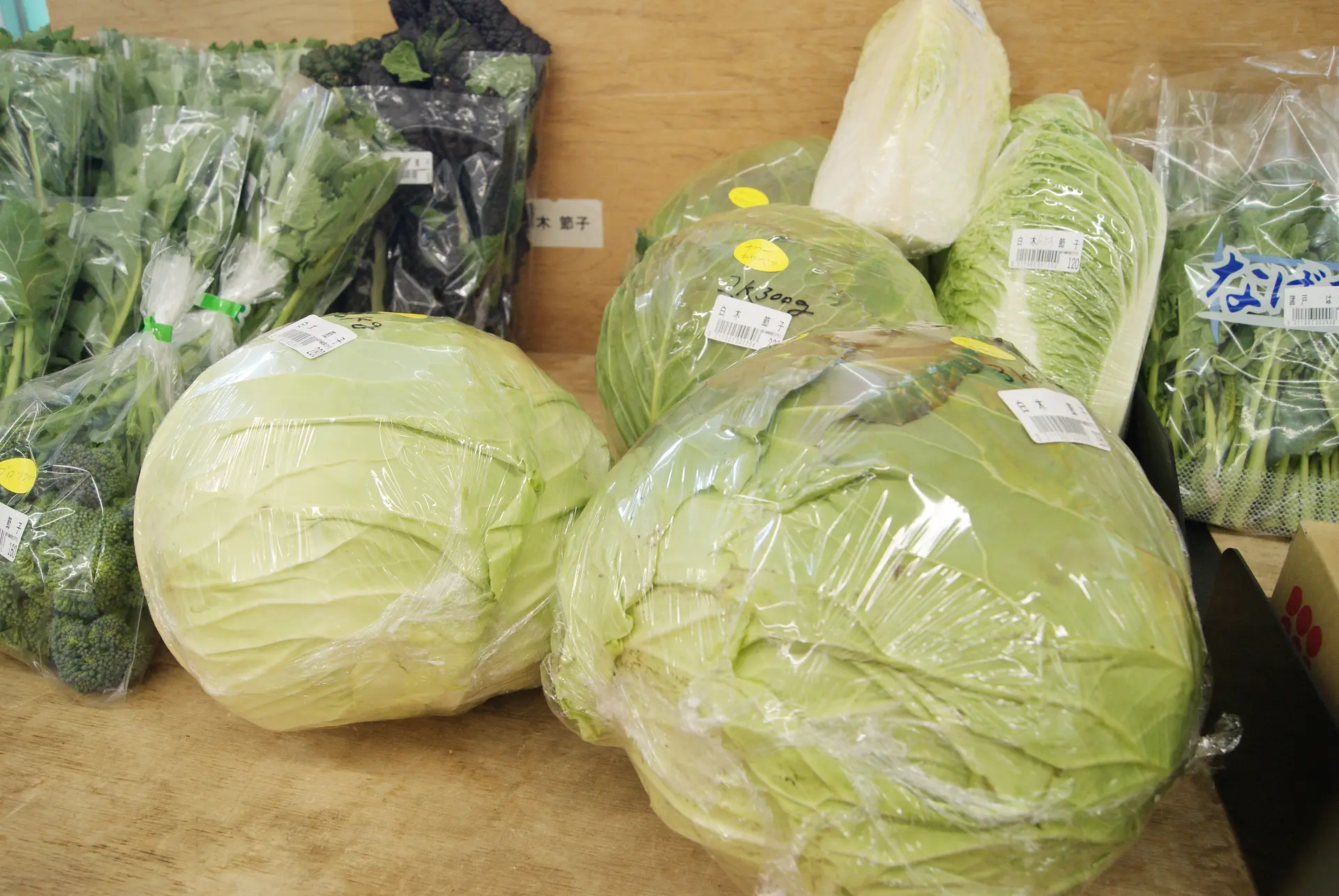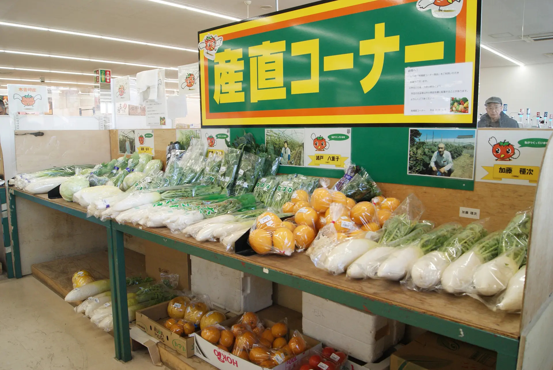 入り口から入ってすぐ、産直コーナーを発見。地元の提携農家さんから直接仕入れた野菜や果物がずらりと並んでいます。