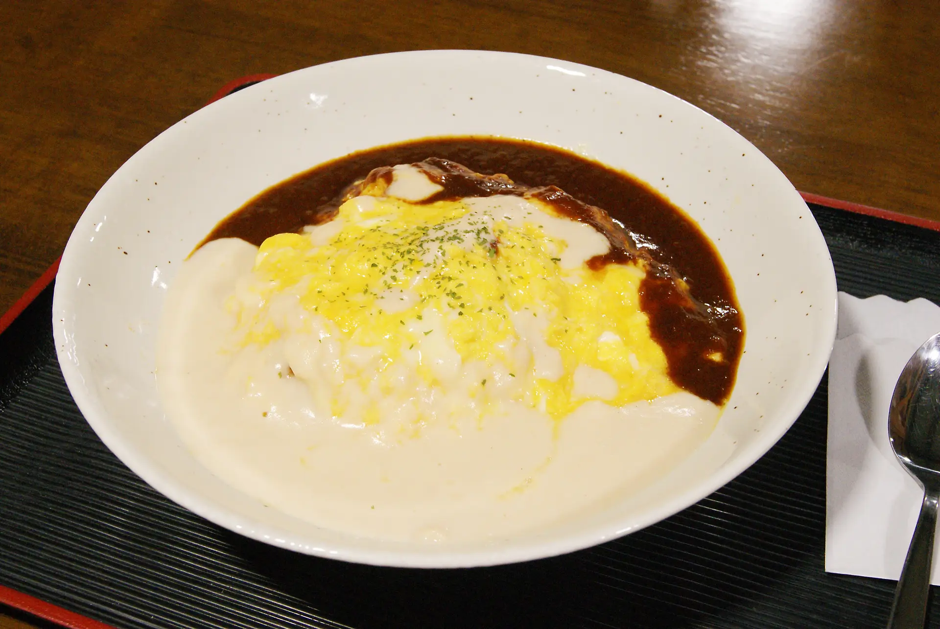こちらは人気メニューの「ふわとろ卵のオムライス」(850円/税別)です。特製のホワイトソースとデミグラスソースがかかっていて、とってもおいしそう!